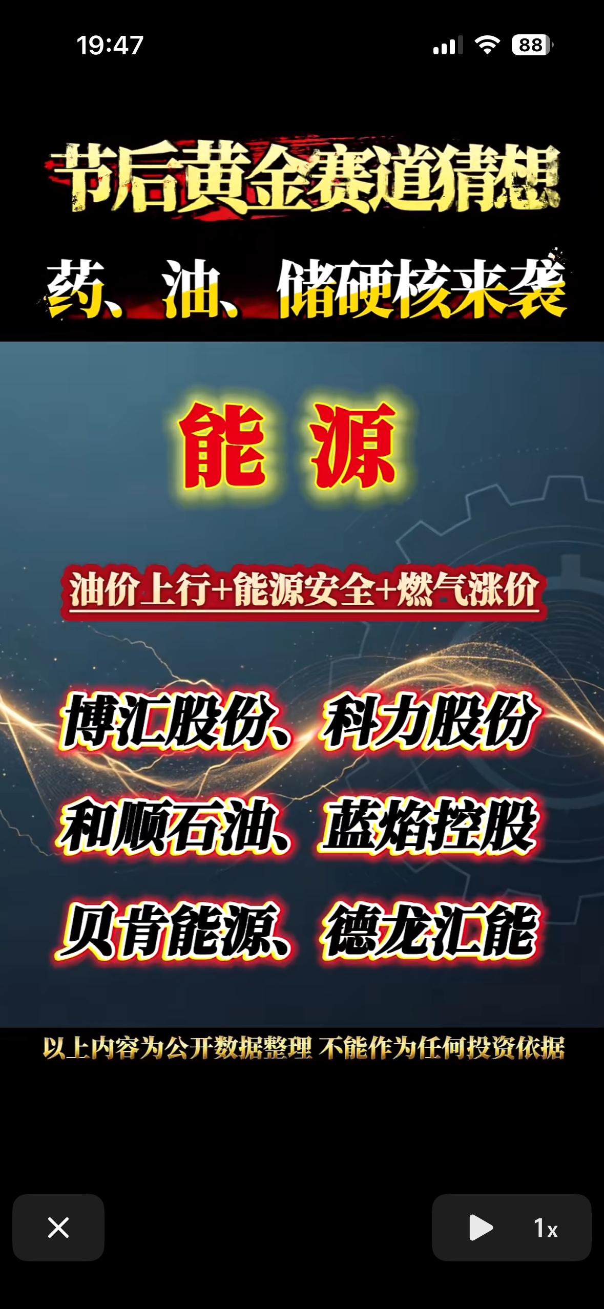 “4月7号节后黄金赛道猜想:药、油、储硬核来袭!”🔥💰🔋 4月7号节后,药、油、储这几个黄金赛道值得关注。中东局势引发能源风暴,2026年3月7日,布伦特原油期货价格突破90美元/桶,WTI原油也同步上涨,天然气、甲醇等能源品种集体狂欢。油气开采企业直接受益,像中国海油桶油成本仅28美元,油价每涨10美元,净利润增厚超百亿元。 再说黄金,8个产油国4月增产,但其长期支撑逻辑未变。黄金定价锚已从短期通胀数据转向“长期货币购买力”,成了“信用对冲工具”。地缘政治的不确定性和全球债务高企,都给金价提供了支撑。这几个赛道硬核来袭,值得好好研究。