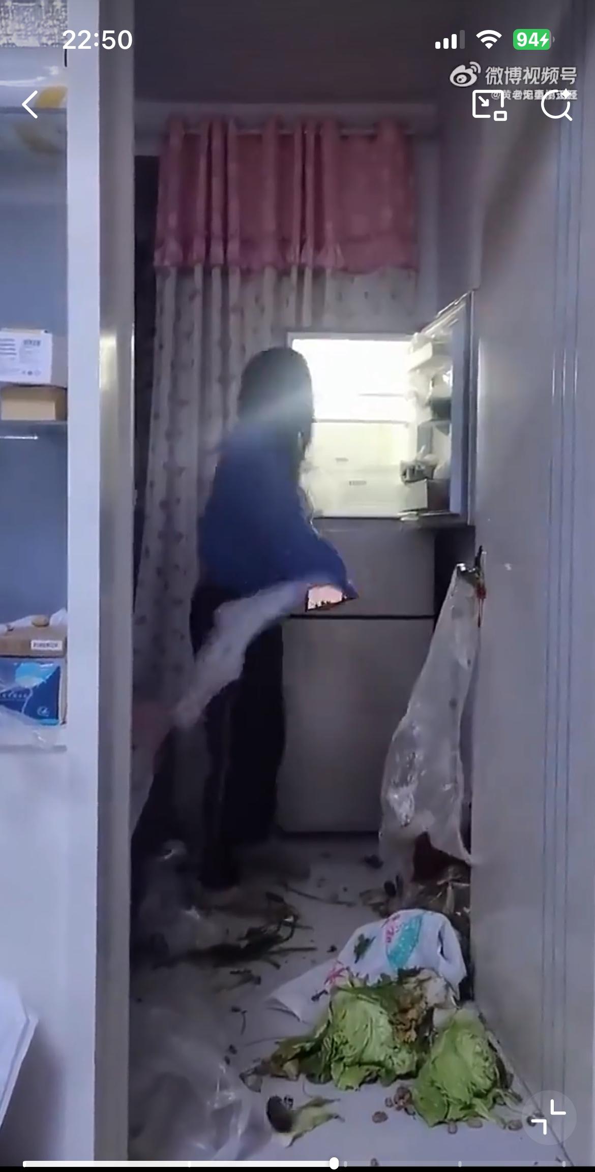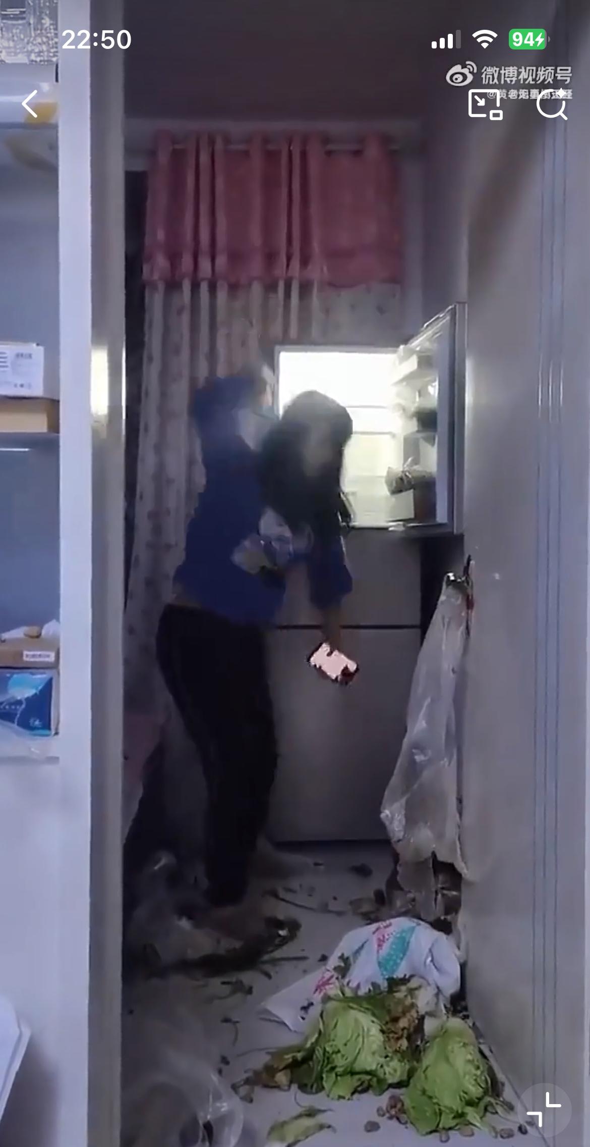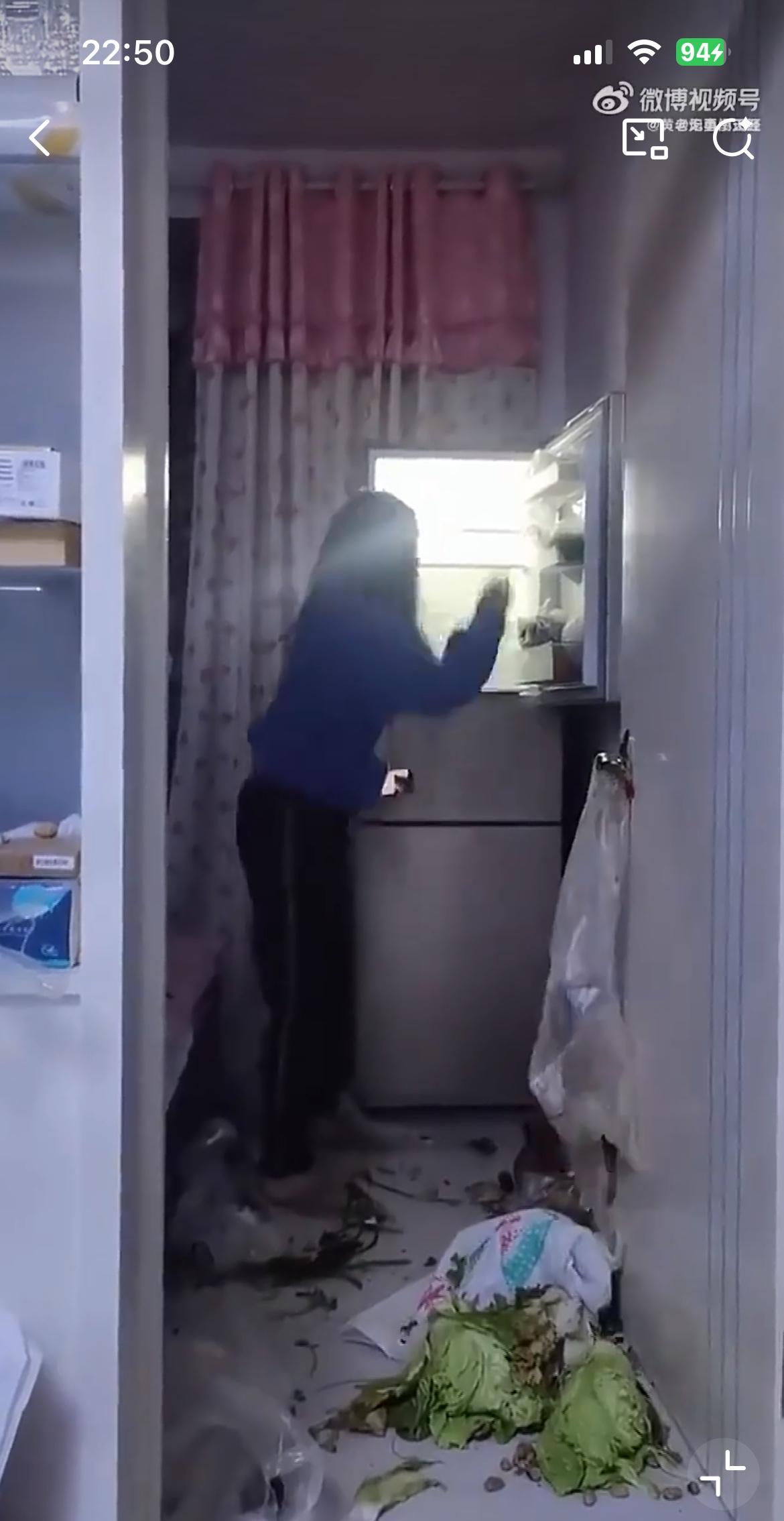 视频里的女人狠砸冰箱里的菜,据说是因为老公给妈妈转了1000块钱。她在老公的手