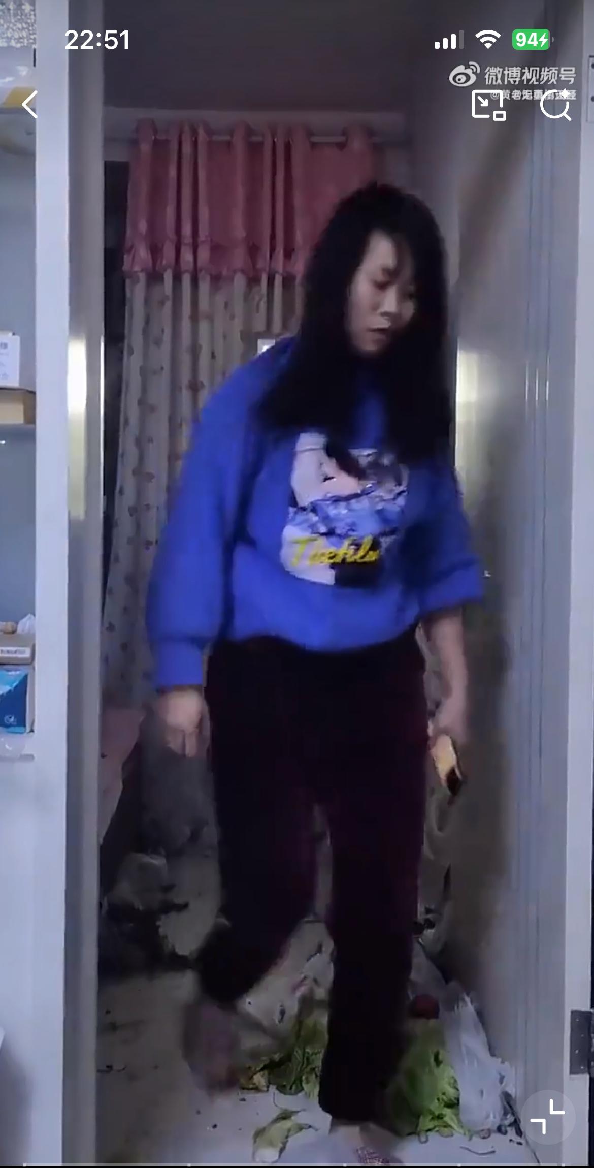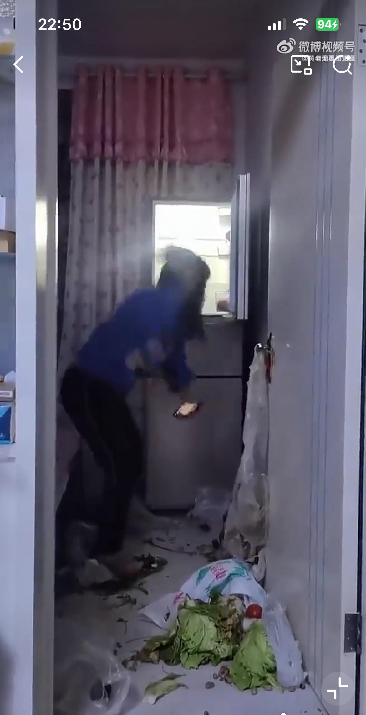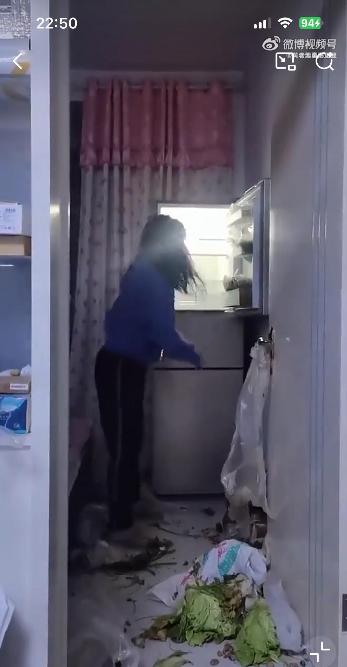 视频里的女人狠砸冰箱里的菜,据说是因为老公给妈妈转了1000块钱。她在老公的手