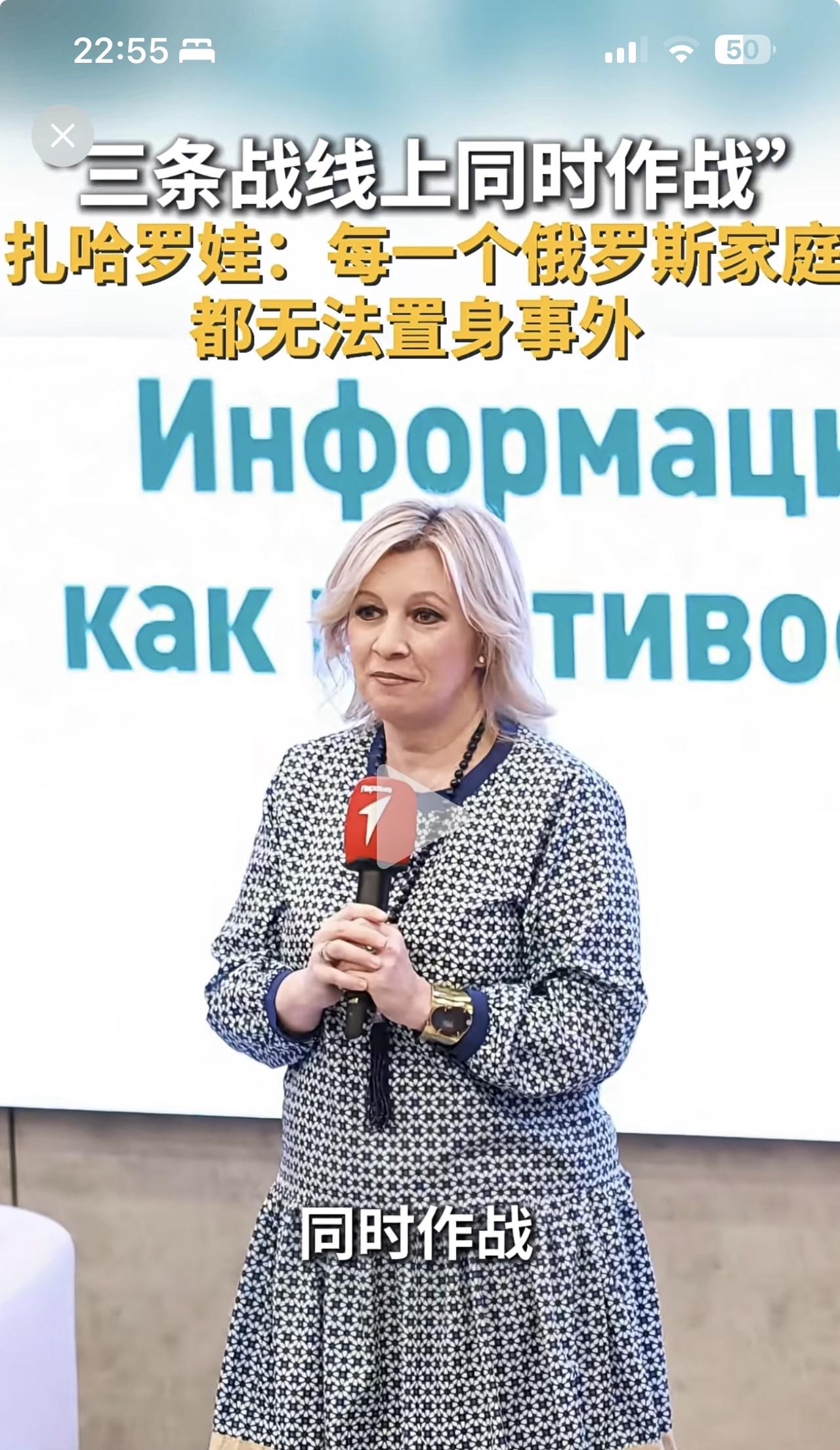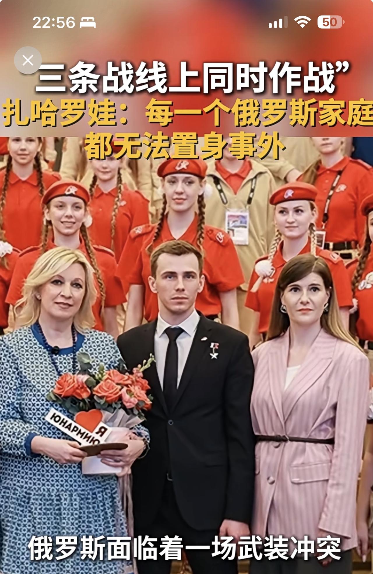 俄罗斯外交部发言人扎哈罗娃:俄罗斯在三条战线上同时作战,每个家庭都无法置身事外。 她说的是哪三条战线?军事、经济和信息。其实,只要把军事停下,其他两条战线迎刃而解。 俄罗斯家庭确实无法置身事外,他们不但要把自己的儿子送到前线参战,自己在后方还要承担战争带来的收入减少,物价飞涨,物资短缺等生活困难。 是谁让他成为这样的?