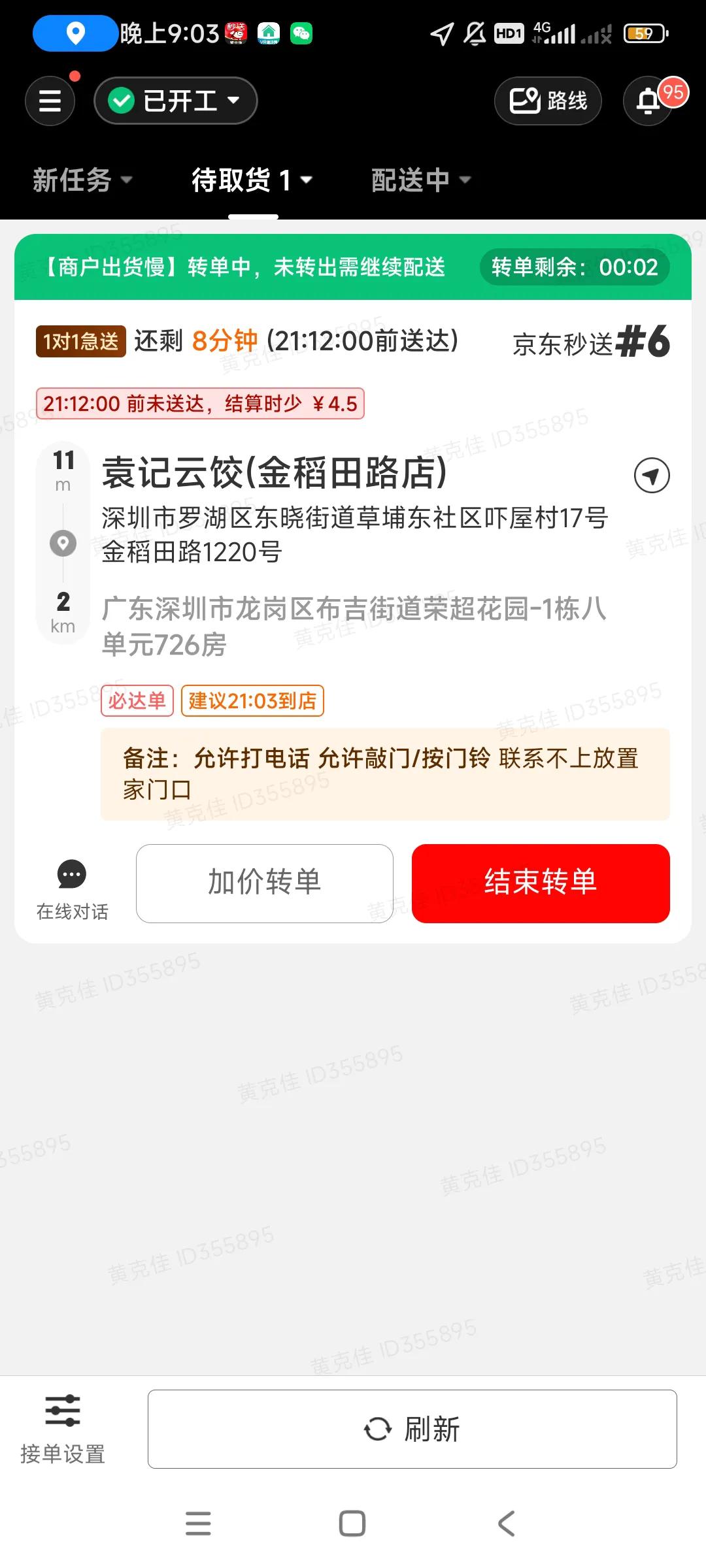 被平台坑了,今天放假,出来跑京东秒送,有一单没仔细看,只看到单价有十元,就接了这个单,才发现是直送单,2.5公里,只有十七分钟,到了取货点,又等了5分钟,才出餐,取完货,只有7分钟就超时了,还有2.5公里,,,, 虽然,骑得快,7分件,还有个大坡,骑行费力,, 最后还是迟到4分钟,扣了4元,主要是商家出餐慢耽误了4分钟,造成超吋了,, 所以这个急送单,以后不敢接了,风险太大了,,
