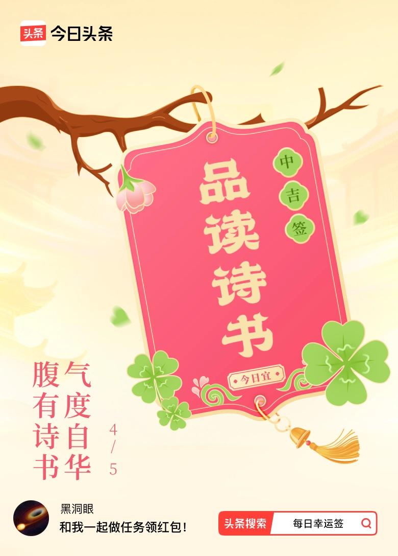 4月·每日幸运签 4月·每日幸运签 嘿,4月我抽到中吉签啦,那签文“腹有诗书,气度自华”,就像一颗小惊喜炸弹,感觉超妙!这一下就让我想起杨绛先生,她就像一座移动的知识宝库,饱读诗书,一言一行都优雅得像一首诗,这就是“腹有诗书”的魔力呀。 读书就像给气质做美容,真能改变一个人。就说我自己,多读好书后,面对生活里那些像苍蝇一样烦人的糟心事,也能心平气和。现在好多人忙着刷短视频,把读书都丢到脑后了。我觉得有空还是得钻进书堆里,说不定真能像签文说的,让自己气质飞升。大家也赶紧来抽抽自己的签文吧!