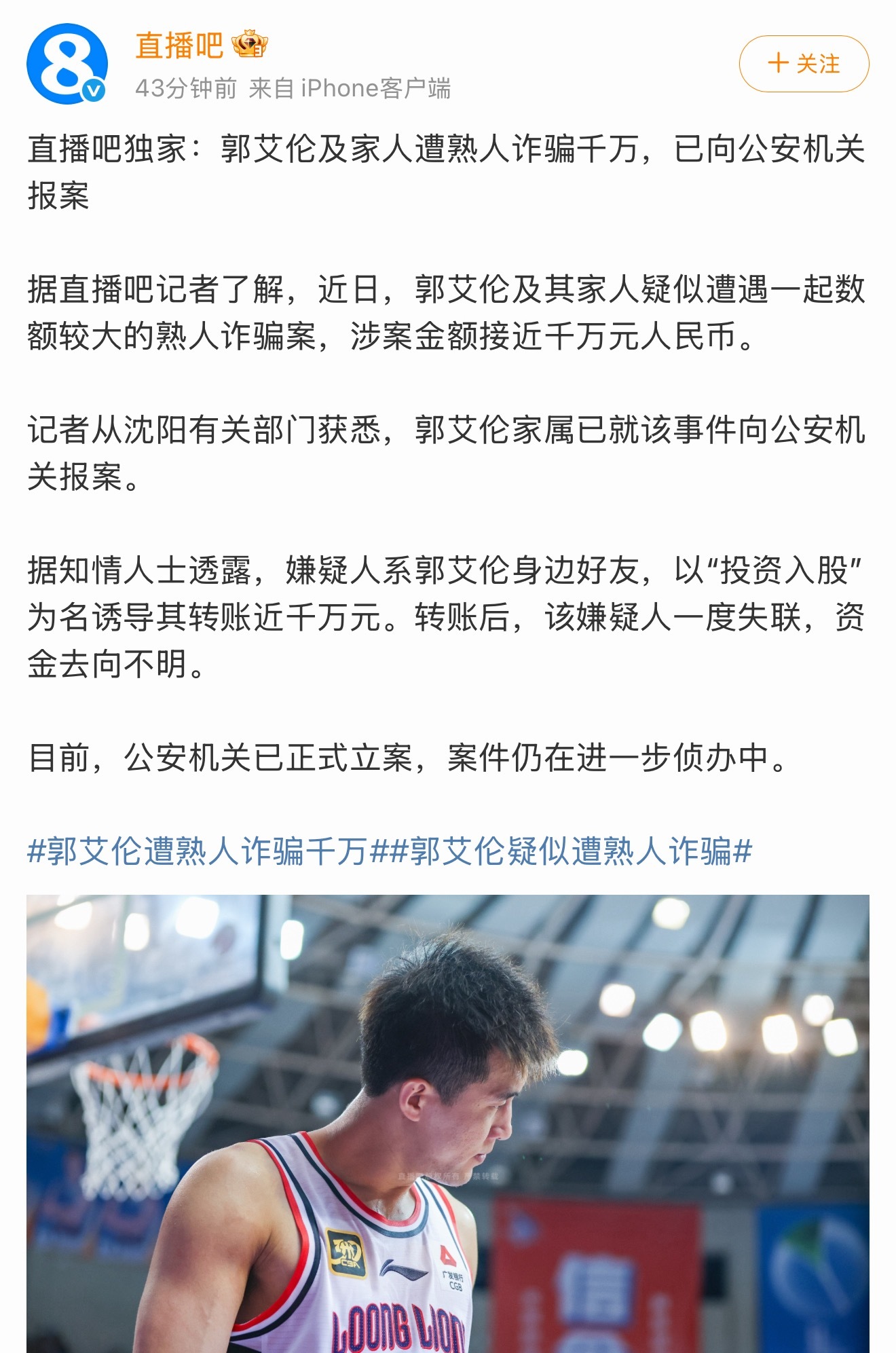 天呐郭艾伦及家人遭熟人诈骗近千万记者从沈阳有关部门获悉,郭艾伦家属已就该事件