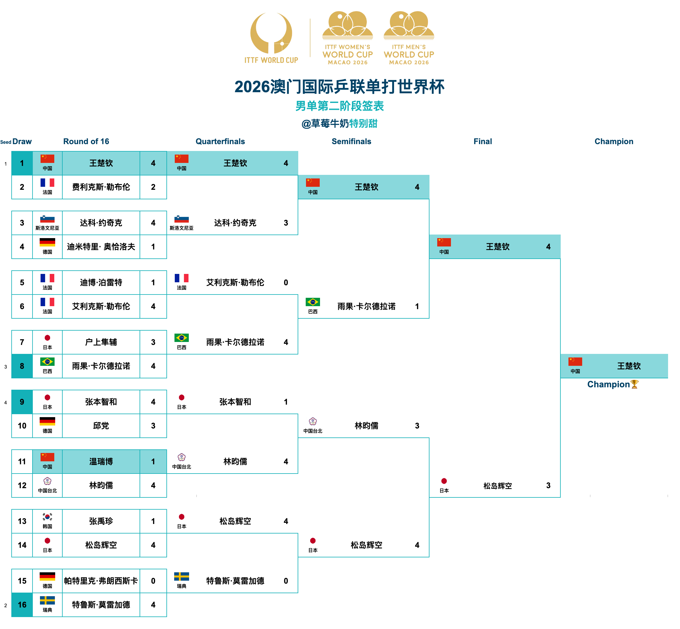 2026澳门国际乒联单打世界杯丨男单决赛王楚钦🇨🇳4-3松岛辉空🇯🇵【9-11,18-16,11-8,11-13,8-11,11-4,11-8】王楚钦🇨🇳获得2026澳门国际乒联单打世界杯男单冠军🥇🎉松岛辉空🇯🇵获得2026澳门国际乒联单打世界杯男单亚军🥈