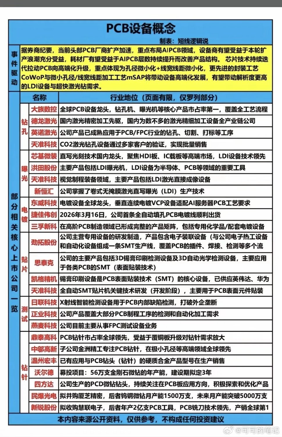 PCB部分设备产业链AI服务器、先进封装技术迭代,推动PCB高端化升级,头部厂商扩产提速,带动PCB设备行业需求增长。核心环节:钻孔看大族数控,曝光看芯基微装,电镀看东威科技,贴片看凯格精机,钻针看鼎泰高科财经今日看盘今日看盘。