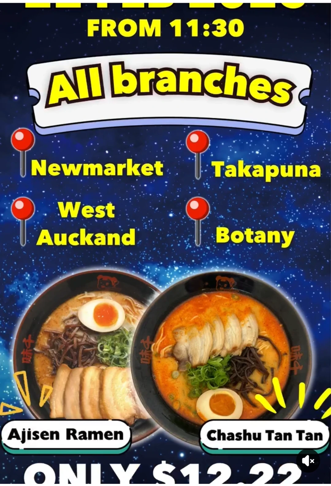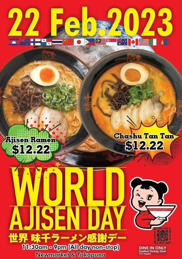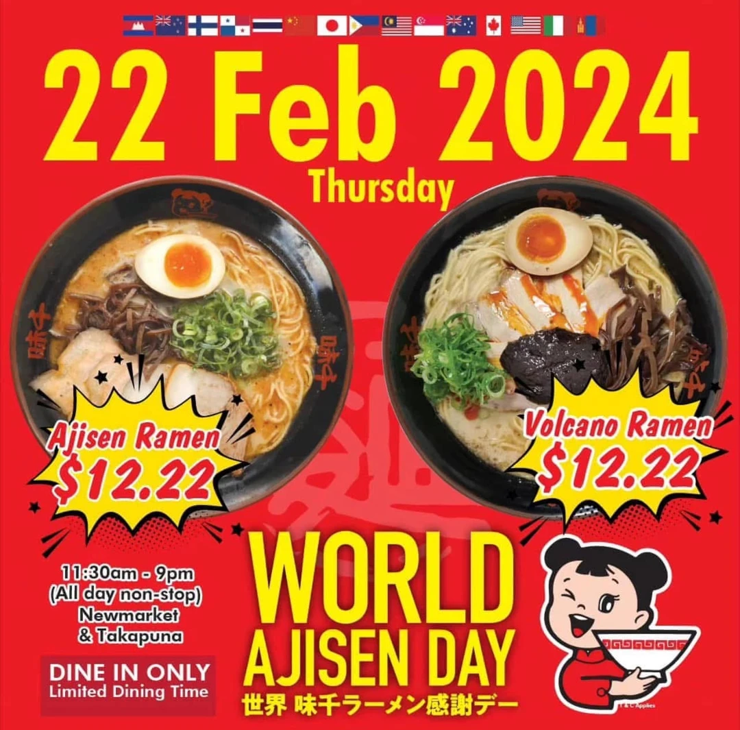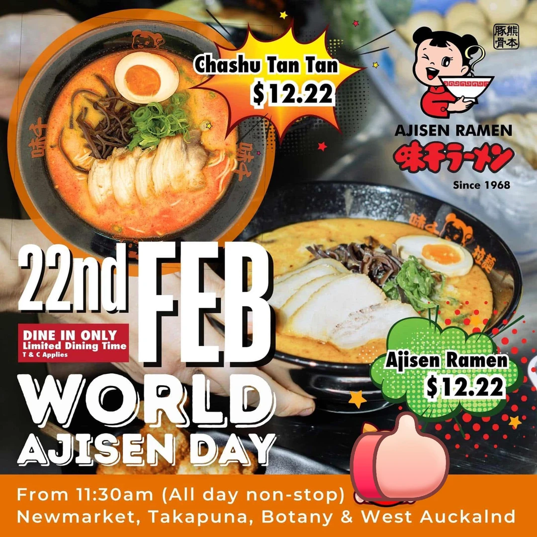 纽村味千拉面世界日 -来啦!就在2 月 22 日[哇R][哇R] (本周六)前往任何一家味千拉面店, 即可 💰12.22 享用拉面![派对R] 仅限堂食,经典味千拉面和叉烧担担面均可享受此优惠[暗中观察R]📍Newmarket, Takapuna, West Auckland and Botany Branch 关注我,下一篇更精彩