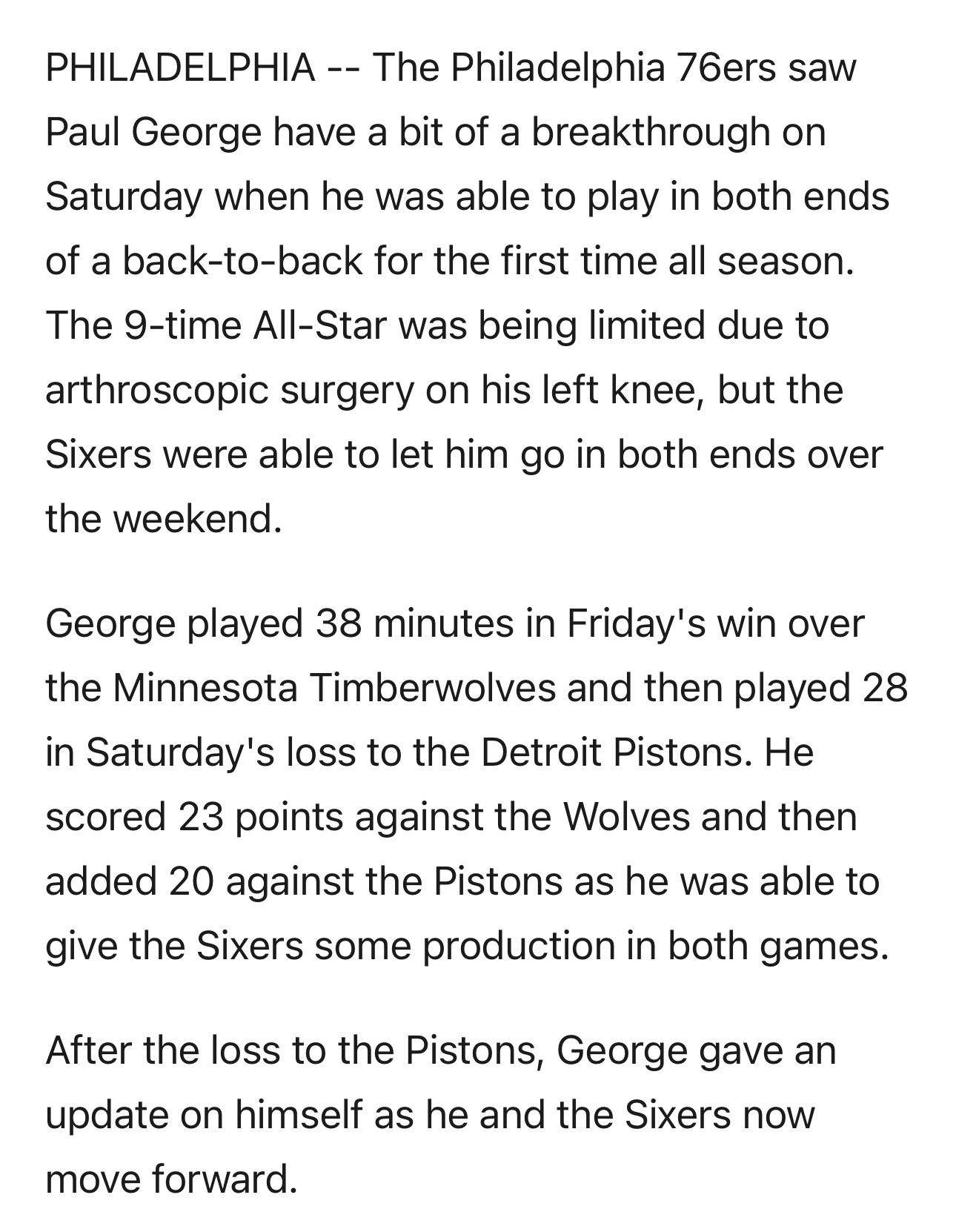 周日的比赛中,费城76人队迎来保罗·乔治的阶段性康复突破:他本赛季首次得以连续出战背靠背的两场比赛。这位九届全明星此前因左膝关节镜手术一直受到出场时间限制,而76人教练组在本周末终于允许他连续出战。