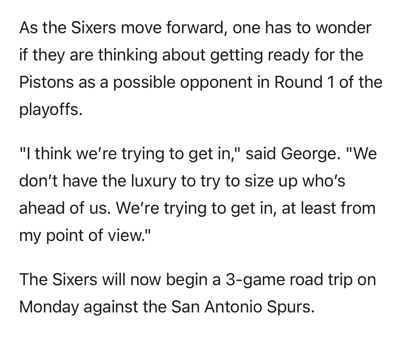 随着赛季进入收官阶段,外界不禁猜测,76人是否已将活塞队视作潜在的季后赛首轮对手。
