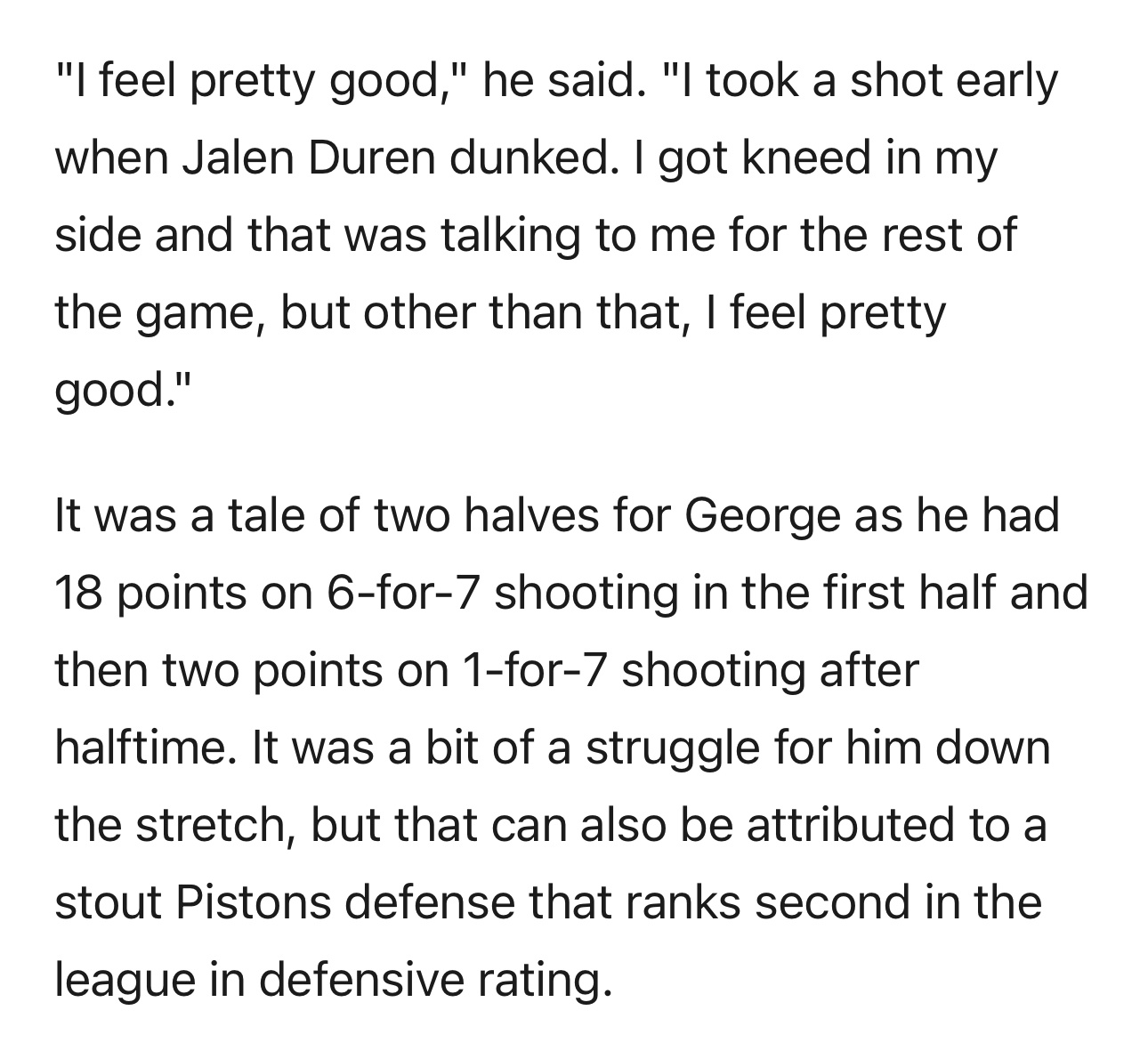 负于活塞队赛后,乔治谈及了自身身体状况以及球队接下来的赛程规划。