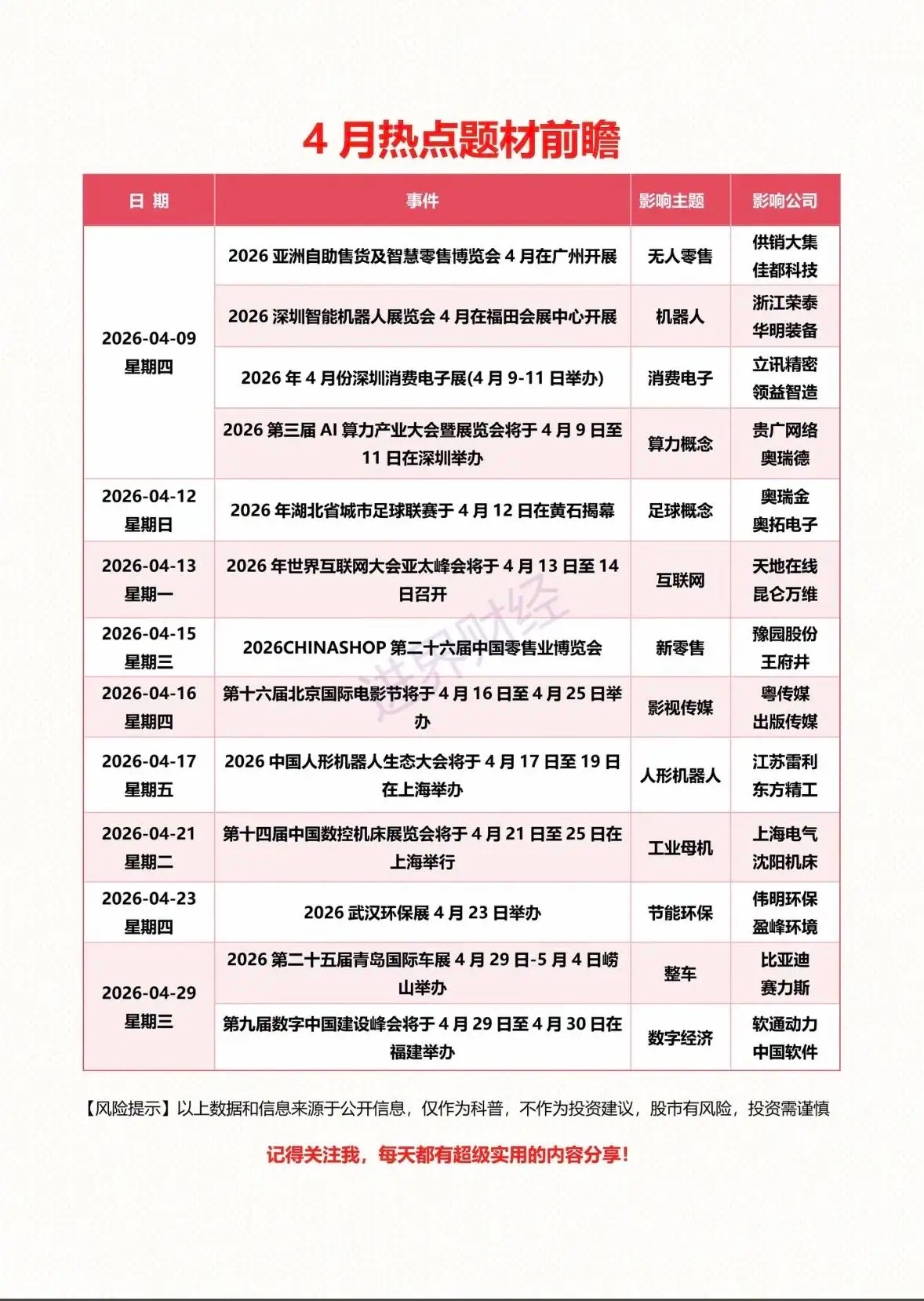 进入4月,A股市场风格从题材炒作转向业绩为王、政策驱动。这月是业绩证伪期,业绩不佳的公司易调整,有真实业绩支撑的板块会成资金避风港和进攻主线。4月“事件轰炸”不断。4月1日,光伏出口退税全面取消,行业洗牌开始,龙头集体涨价,主流组件涨幅15%-20%,高功率N型组件最高涨50%。中旬算力、航天、机器人三大主线或爆发,月底数字中国峰会收官。资金流向也有变化,三月下旬机构减仓高位震荡板块,转向低位低估值、政策加持的方向,电力、军工等防御性板块,算力、航天等高弹性成长赛道成资金共识方向。