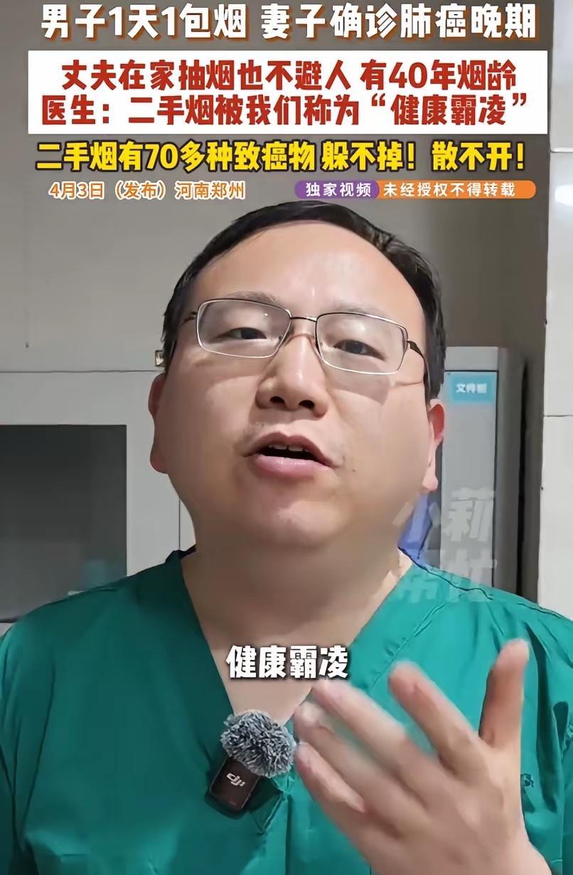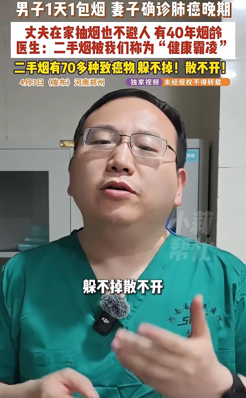 悲剧还是发生了!河南郑州,一男子有40年的烟龄,每天雷打不动一包烟,可自己没什么,妻子的身体却出现了异常,去医院检查后确诊肺癌晚期,网友:“躺家里也不安全!” 这位丈夫怎么也想不到,自己抽了四十年的烟,最后病倒的会是妻子。他每天一包烟,雷打不动,客厅、卫生间,家里到处是他的“吸烟区”。妻子劝过,吵过,最后只能默默忍受。她以为开窗通风就没事,以为烟味散了就干净了。 直到最近,一向身体不错的妻子开始频繁咳嗽,胸口发闷。去医院一查,结果是肺癌晚期。她懵了,自己不抽烟不喝酒,生活规律,怎么会得肺癌?医生详细问诊后,把目光投向了她身边的丈夫。四十多年的烟龄,妻子等于被动吸了四十多年的二手烟。 河南省肿瘤医院的医生分析,张女士长期暴露在二手烟环境中,对烟草中的化学刺激比较敏感,最终导致了基因突变,诱发肺癌。二手烟根本不是“散一散”就没事了,它含有超过7000种化学物质,其中致癌物至少有69种。这些毒素紧紧粘在人的DNA上,日积月累,破坏细胞的正常修复,最终可能引爆癌症。 丈夫抽完烟,烟雾散了,但尼古丁、重金属等有毒物质会残留在家里的沙发、窗帘、墙壁上,甚至他的头发和衣服里,这就是“三手烟”。家人通过呼吸、皮肤接触,不知不觉就把这些毒物吸进了身体。尤其是孩子,喜欢爬行、啃咬物品,受害更深。你以为躲到阳台、厕所抽就没事了?三手烟的残留时间可以长达数月甚至数年,通风也很难彻底清除。 “躺家里也不安全!”这句话道出了无数非吸烟者的无奈,家里本应是最安全的港湾,却因为亲人的一个习惯,变成了健康的风险区。有网友说,这就像一场无声的“健康霸凌”。 吸烟从来不是一个人的事,你吐出的每一口烟,都在让最亲近的人分担风险。世界卫生组织的数据显示,全球每年约有120万人死于二手烟暴露。在中国,尽管多地有室内禁烟令,但餐饮场所违规吸烟率依然接近一半。 总有人抱着侥幸心理:“我抽了这么多年,不也好好的?”但癌症的发病有复杂的个体差异,有些人代谢能力强,暂时扛住了,但毒素对身边人的伤害却是实实在在的。你的“没事”,可能是家人在用他们的健康为你买单。 戒烟当然不容易,但为了所爱之人,这份努力值得。如果暂时做不到,至少请做到:不在室内吸烟,不在家人身边吸烟,吸烟后及时洗手、换衣,减少残留。 各位读者你们怎么看?欢迎在评论区讨论。