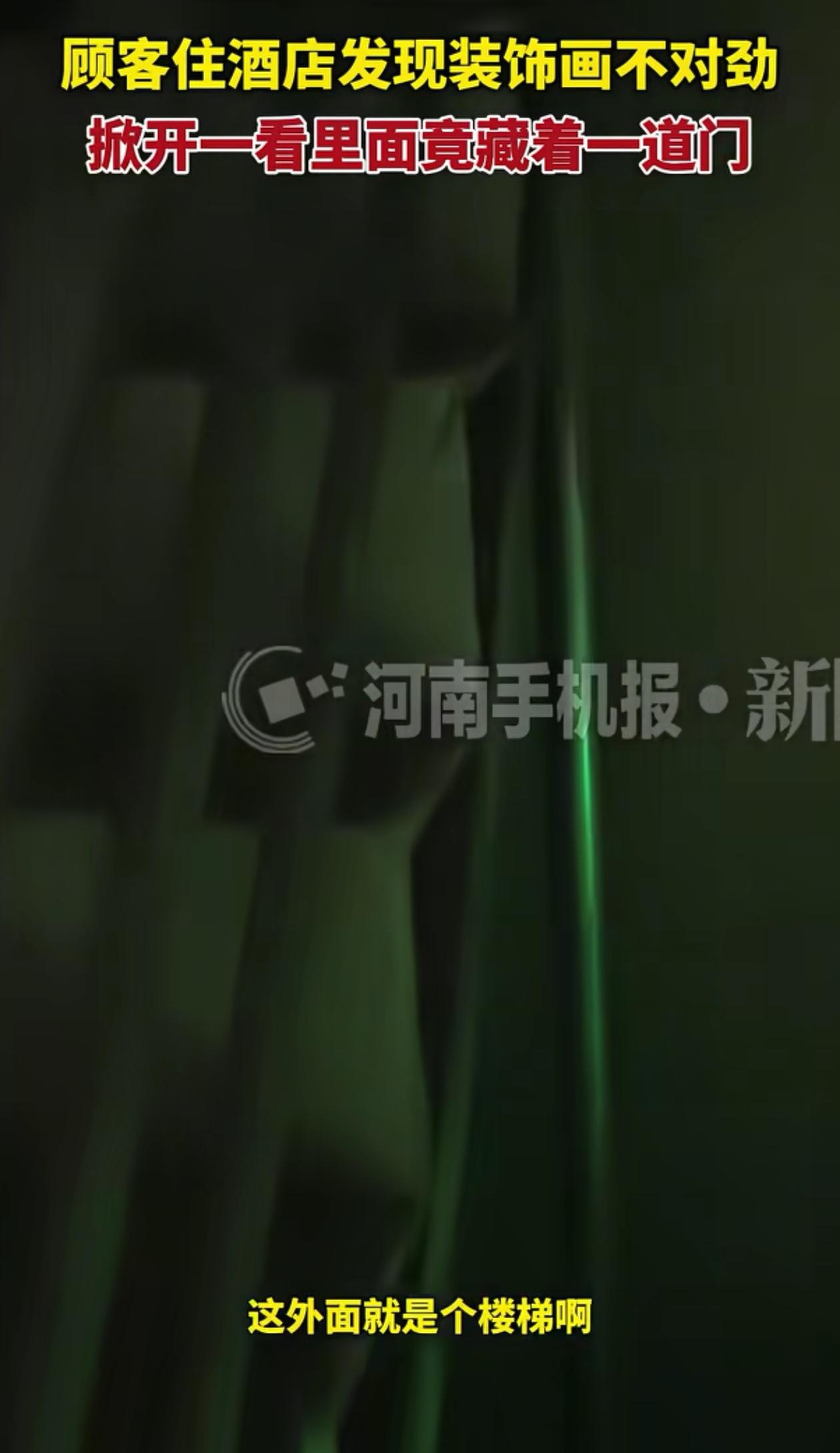 万万没想到!湖北,女子住酒店,发现房间中间有一副画,怎么看怎么奇怪,她掀开画一看,还真让她在后面发现了一道暗门,吓得女子当场就不敢住了。 这个画摆放的位置真的非常奇怪,旁边就是电视,然后莫名其妙放这么大一幅画,在视线上就让人觉得不舒服。 所以女子就掀开画往后面看了看,发现后面竟然有个门,虽说从屋内锁着,但女子很轻松就把门打开了,但让他没想到的是,这扇门后面竟然是一处楼梯! 楼梯里没有灯光,只有安全出口的指示牌散发着绿油油的光芒,一片漆黑里别提有多吓人了。 女子赶紧回到房间把门锁好,但即便如此,她还是觉得害怕。因为这道门虽然锁着,但却是用布做的,如果有人要用蛮力开门,她是防不住的! 对于女子的担忧,有网友表示认可,谁也不想大晚上睡着了房间里多个人吧?也有网友说要是自己遇到了,肯定赶紧走。 看到这个楼梯反正我是吓了一跳,这么黑漆漆的一点光都没,也不知道通往哪里。万一有人不怀好意藏在里面,估计都很难发现。 但更让人搞不懂的是,酒店既然知道屋里有这样一个门,为什么不事先告诉顾客呢?这样的房子给顾客住,谁又能住得安心呢? 换成是你你会接着住吗?
