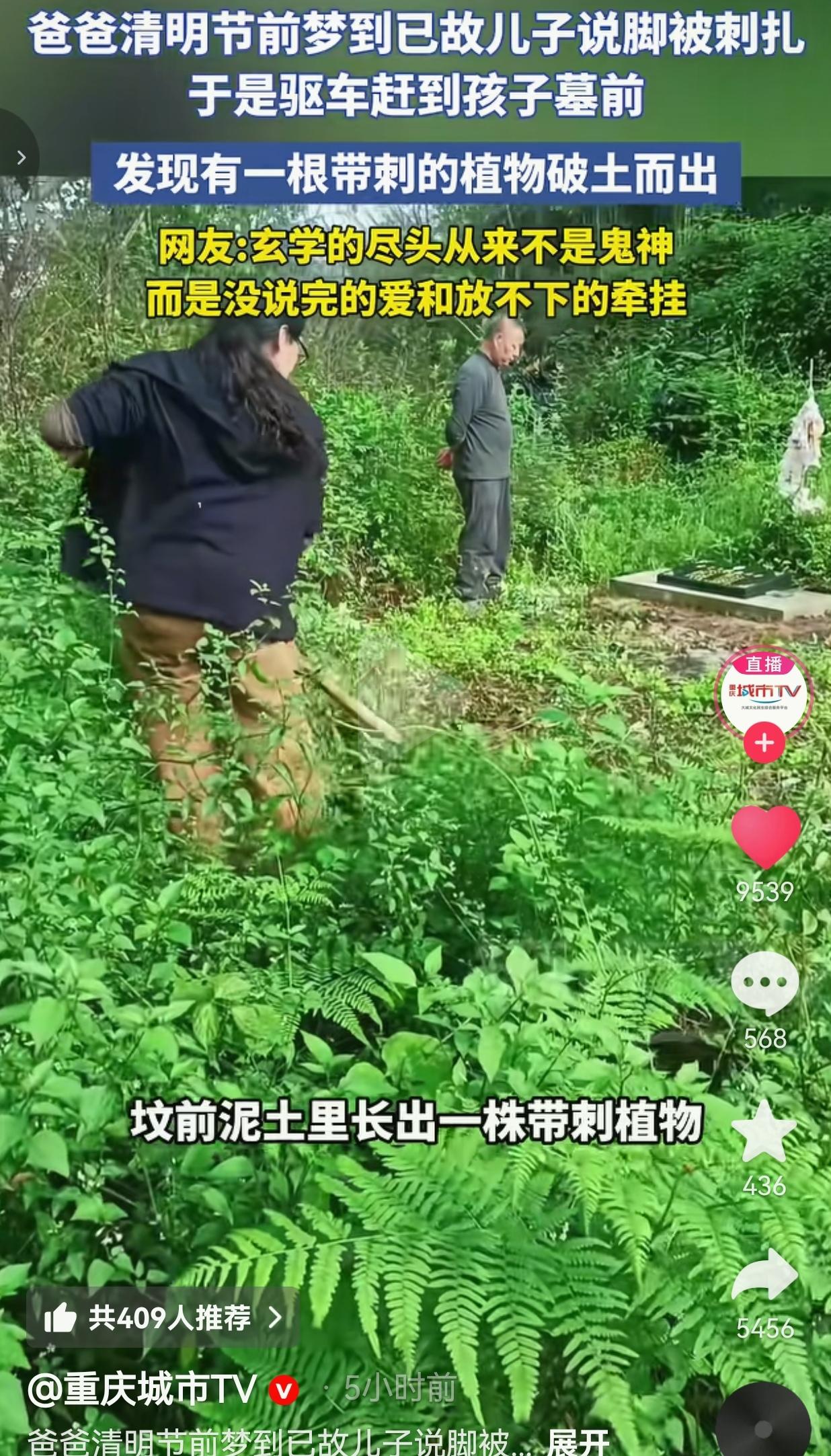 破防了!清明前爸爸梦到亡儿喊脚疼!赶到坟前一看,瞬间泪崩。网友:这哪是玄学,是刻进骨血的父爱! 事情发生在重庆,4月3号,离清明就剩两天。一位叫王彪的爸爸,夜里做了个无比清晰的梦:已经去世的儿子王腾磊,就那么站在他跟前,皱着眉、带着哭腔跟他说:“爸爸,我的脚底下好多刺,疼得受不了了!” 爸爸一下就从梦里惊醒,心脏揪得跟被针扎一样,满脑子都是儿子那句“脚疼”。 他根本没心思多想,也没管什么封建迷信,脑子里就一个念头:我得去看看我娃! 他当即就开车,火急火燎地往孩子的墓地赶。 到了坟前,他蹲下来仔仔细细地扒开坟头的杂草,结果眼前的景象,直接让他泪崩了——就在儿子墓碑前、本该是脚的位置,硬生生从泥土里钻出了一株带刺的植物!那刺密密麻麻,就那么扎在坟土上,跟梦里儿子说的“脚被刺扎”,分毫不差! 孩子的妈妈刘晓莉当场就红了眼,二话不说,小心翼翼地把这株带刺的植物连根拔了,把坟前的土清理得干干净净,就怕再扎到孩子。 墓碑上“爱子王腾磊之墓”几个字,还有“天崩椎山愿,彻子河无来”的碑文,每一笔都刻着父母撕心裂肺的痛。 你说这是巧合吗?我不信!这世界上哪有这么巧的事?这根本不是巧合,是孩子用最温柔的方式,把没说出口的疼,变成了看得见的模样!是父子俩刻在骨子里的牵挂,是阴阳两隔都割不断的念想!爸爸日思夜想,才在梦里听见孩子的声音;哪怕隔着生死,也要第一时间冲过去护着自己的娃! 网友评论区直接炸了,全是破防的声音。 网友看到后评论说:我真的哭死!什么鬼神?什么玄学?就是爸爸太想孩子了,孩子也太想爸爸了!这是双向奔赴的爱啊! ​ 也有的网友说:破防了!父母对孩子的爱,真的能穿越生死!这爸爸得多疼啊,梦里都在心疼孩子,醒了就马不停蹄地赶过去,这就是父爱如山吧! ​ 还有的网友说自己的经历:我奶奶走的时候,我梦到她跟我说被子薄,第二天去坟上,真的发现坟头塌了一块,漏风了!从那以后我就信了,亲人之间,真的有心灵感应! ​ 也有的网友说:那些说封建迷信的,你根本不懂什么叫失去至亲的痛!这不是迷信,是一个爸爸对孩子刻进DNA的牵挂,是阴阳两隔都拆不散的亲情! 说实话,我看完这个视频,眼泪止不住地流。 我们总说生死两隔,阴阳殊途,可在父母的爱面前,生死算个屁!孩子走了,可在爸爸心里,他永远是那个2012年出生、会喊疼、会撒娇的小孩。哪怕人不在了,只要梦里听见一句疼,爸爸就能立刻穿越山海,冲到他身边,为他扫平一切障碍。 这根本不是托梦,这是日思夜想的牵挂,是爸爸心里永远放不下的执念;是一个父亲,在这个世界,还在拼尽全力地守护着自己的孩子。 我们总在说什么科学,什么理性,可在亲情面前,所有的理性都不堪一击。因为爱,从来都不讲道理,从来都不分阴阳。 清明是什么?清明不是烧纸,不是扫墓,是我们对逝去亲人的牵挂,是我们告诉他们:我们从来没有忘记你,我们永远在爱你,永远在等你。 这株带刺的植物,扎在孩子的坟上,疼在爸爸的心里。可爸爸拔的不是刺,是对孩子一辈子的牵挂,是阴阳两隔都割不断的父子情。 事件曝光后,全网都在感慨:所谓玄学,从来都不是鬼神,而是刻进骨子里的思念,是没说完的爱,是永远放不下的牵挂。 最后我想说:所谓阴阳两隔,从来都不是爱的终点,而是另一种形式的陪伴。父母的爱,能穿透生死,能跨越阴阳,永远为你撑腰,永远为你遮风挡雨!
