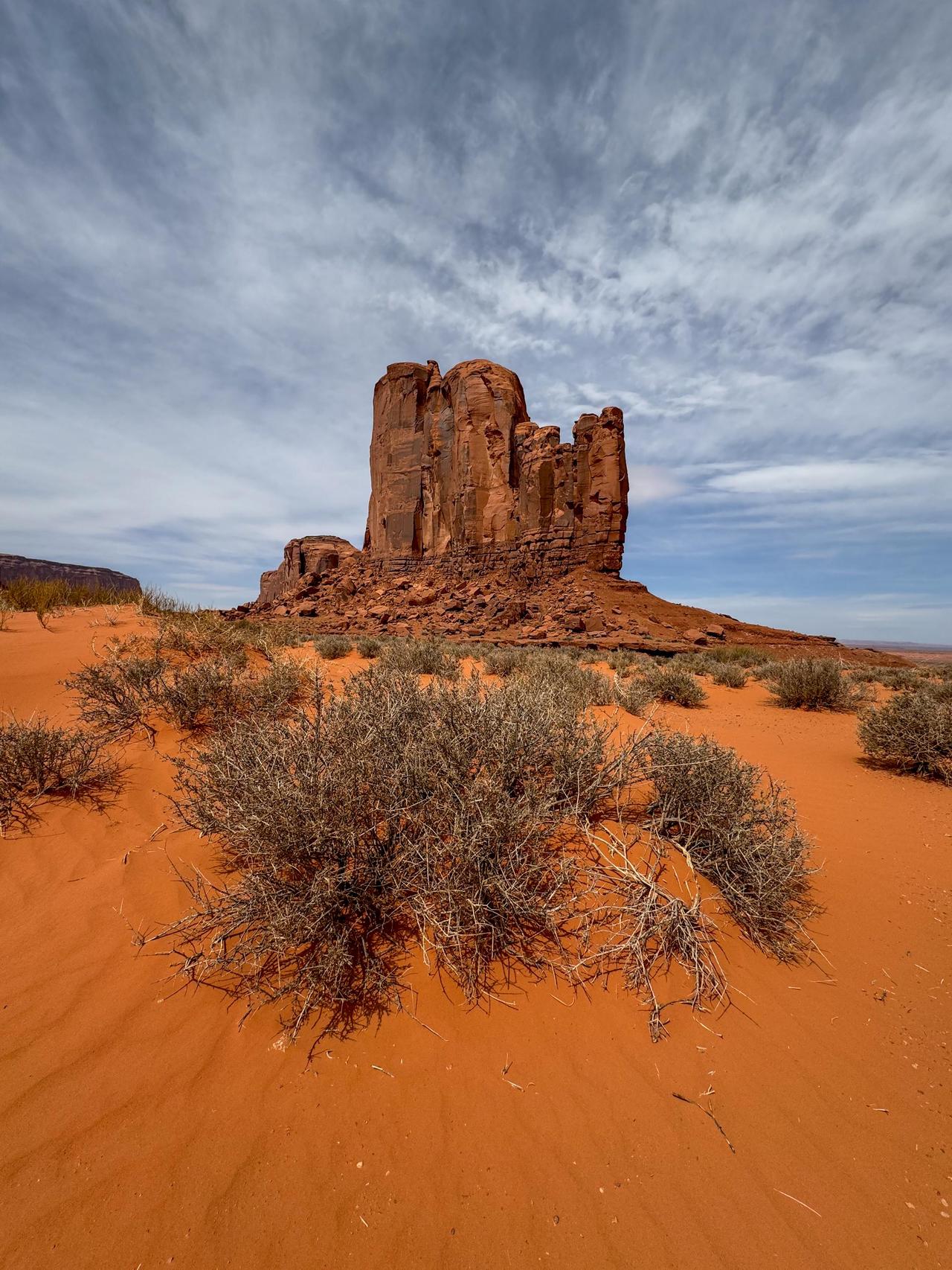 纪念碑谷的砂岩塔在夕阳下变成深红色。
