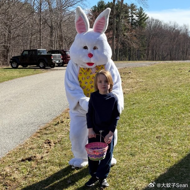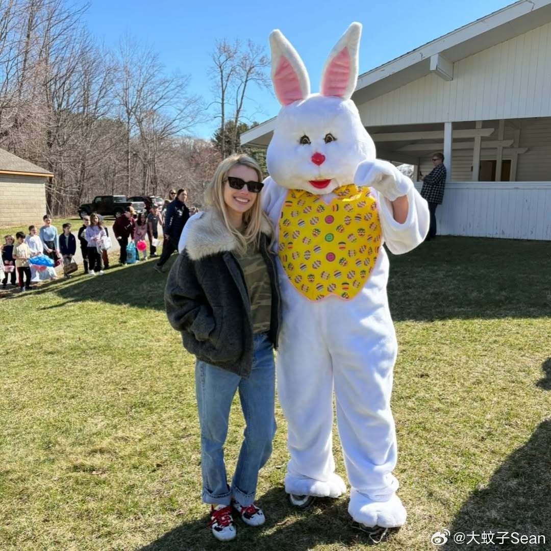 Emma Roberts艾玛罗伯茨和儿子在复活节参加社区活动的私照,见到兔子的小Rhodes有点拘谨🤣