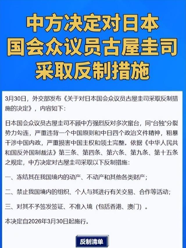 3月30日,外交部的一纸令下,让一个叫古屋圭司的日本政客彻底“火”了。 这消息像是在东京政坛投下了一枚重磅炸弹,引发的震动至今还没平息。 很多人可能对这个名字感到陌生,但在搞“台独”的小圈子里,他可是个响当当的“大红人”。 自2018年接手那个所谓的“日华议员恳谈会”以来,古屋圭司就没少在台海问题上煽风点火。 他不仅频繁窜访台湾,还跟赖清德之流打得火热,甚至被对方吹捧为日本“最挺台”的人。 根据外交部第20号令,依据《反外国制裁法》,对他实施了精准打击:冻结财产、禁止交易、永久拒签。 外交部发言人毛宁用了九个字评价此人:“不收敛、不收手、不知止”,字字千钧,直接定性。 就在3月16日,他跑到台北参加“玉山论坛”,公然鼓噪日本自卫队要跟台湾军队、美军搞什么“三方交流”。 这种赤裸裸的军事勾连,他居然大言不惭地包装成“文化合作”,简直是把世人都当成了傻子。 这摆明了是日本执政层在背后递刀子、递梯子,古屋圭司不过是那个站在前台跳脚的卒子。 日方高官一边喊着“遗憾”,一边搬出“言论自由”来洗地,试图把挑衅主权的行径美化成民主权利。 这种厚脸皮的逻辑,不仅罔顾国际法,更是对中日四个政治文件的公然践踏。 古屋圭司本人倒是还在嘴硬,面对媒体连甩三句话,一副“死猪不怕开火烫”的架势。 他说自己没资产、不去中国,所以制裁没影响,甚至还反唇相讥说这是“理所当然”。 这种表演,其实是做给日本国内的右翼势力看的,试图给那些蠢蠢欲动的人“壮胆”。 制裁不仅是关上一扇门,更是断掉一整条利益链,任何想跟他做生意的组织和个人,现在都得掂量掂量后果。 从前自卫队高官到资深政客,中方的反制名单正在精准扩容,目标清晰且动作凌厉。 高市早苗政府如今在众议院握有绝对优势,正憋着劲要修改“和平宪法”。 看看日本2026财年的防卫预算,高达9.04万亿日元,折合566亿美元,这已经是连续第14年增长了。 这哪里是单纯的防御,这分明是在为一个“能打仗”的国家疯狂积蓄力量。 更绝的是教育领域的“毒化”,3月24日审定的高中教科书里,竟然公然抹杀“慰安妇”的历史事实。 就在古屋被制裁的前几天,中国驻日使馆还发生了一起惊心动魄的“闯馆”事件。 一名23岁的现役自卫队军官,持刀翻墙闯入我使馆,叫嚣着要进行暴力袭击。 一个现役军官,带着18厘米的利刃,千里迢迢搞暗杀式袭击,事后日方竟然只给了一个轻飘飘的“遗憾”。 这种从政客挑衅到军人暴力的联动,反映的是日本右翼势力整体的躁动与失控。 日本社会内部并非没有理性的声音,不少网民和学者也在质问:难道表达意见需要带刀吗? 但在民粹和右翼政治的裹挟下,这些理性的声音正变得微弱,这才是最令人唏嘘的地方。 一个曾对台湾人民犯下滔天罪行的国家,如今却打着“保护”的旗号指手画脚,这本身就是巨大的讽刺。 国台办那句“汲取历史教训”,绝不是一句空话,而是对某些人最严厉的心理侧写。 《反外国制裁法》、出口管制措施、精准点名外交,这套组合拳已经打得越来越顺手,越来越有力度。 国际关系的基础是契约,是原则,而不是某些政客为了选票而玩的危险游戏。 古屋圭司的下场,只是一个开始,它给所有试图挑战底线的人打了一个样。 谁要是觉得可以一边赚着中国的钱,一边砸着中国的锅,那他一定会跌得很惨。 球现在在日本那边,是选择回归理性,还是继续在火边跳舞,时间会给出最后的答案。 总之还是那句话,红线就在那里,谁敢越过去,谁就得准备好买单!