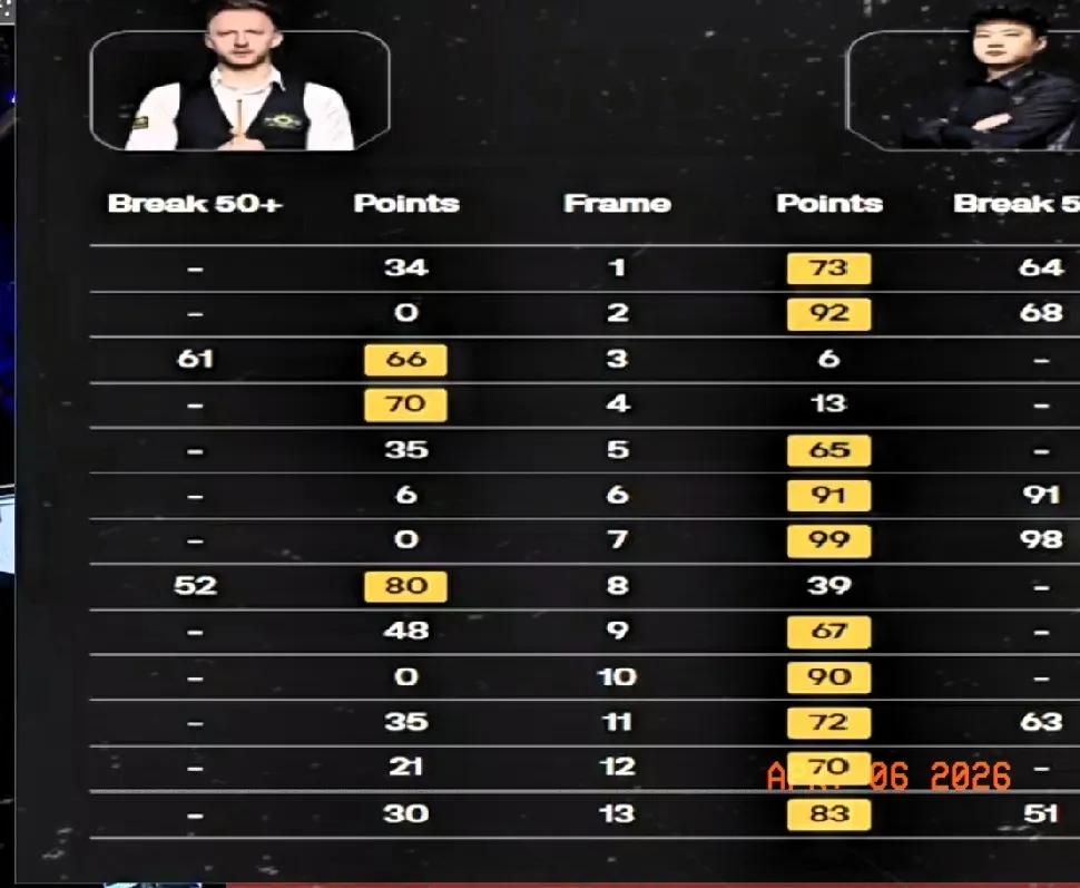 今天这场比赛,赵心童如此轻松地以10-3获胜,真不是赵公子打得好,而是特鲁姆普这个世界第一,经常吹牛只使出了百分之几力气就能赢球的人,表现实在太糟糕了! 看看双方得分表就可以分析,今天赵心童赢10局,只打了5杆50+,没有一杆破百。 赵心童今天不是赢在准度炸裂的进攻上,让个担心的防守方面也未输给特鲁姆普。 特鲁姆普今天是攻防两端全面溃败!