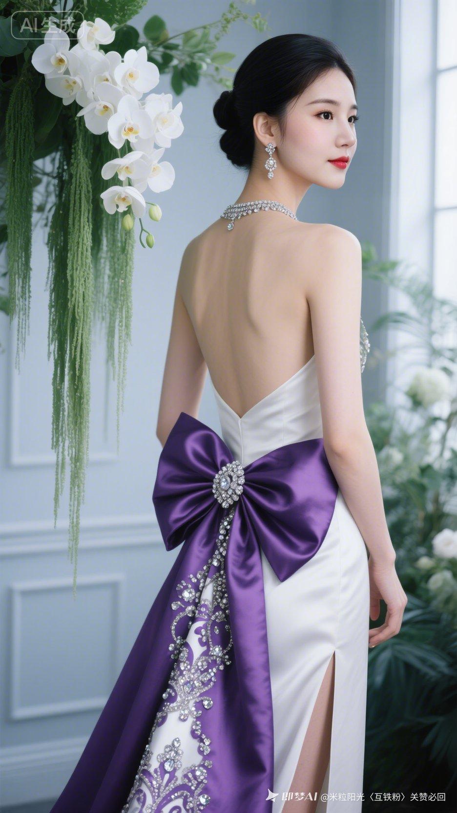 静院流苏繁花垂落绿植环绕,精致盘发红唇佳人,轻奢室内出镜。紫白撞色缎面露背高开叉礼服,蝴蝶结镶钻流光溢彩,光影衬质感,明艳华贵又性感动人。