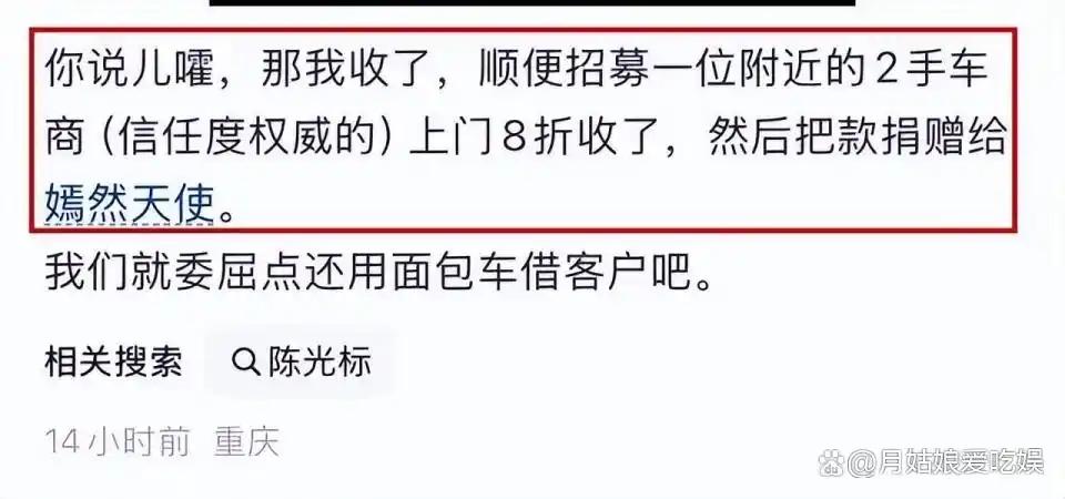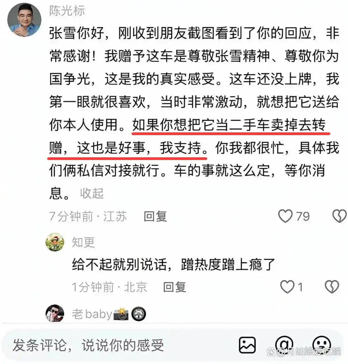 网络上陈光标赠张雪豪车事件传得沸沸扬扬,而张雪回复直接让二手车商家八折收购变现捐给嫣然天使医院,看到网传的几张两人对话截图,不得不说,张雪不上当去配合他起舞,真是条汉子。