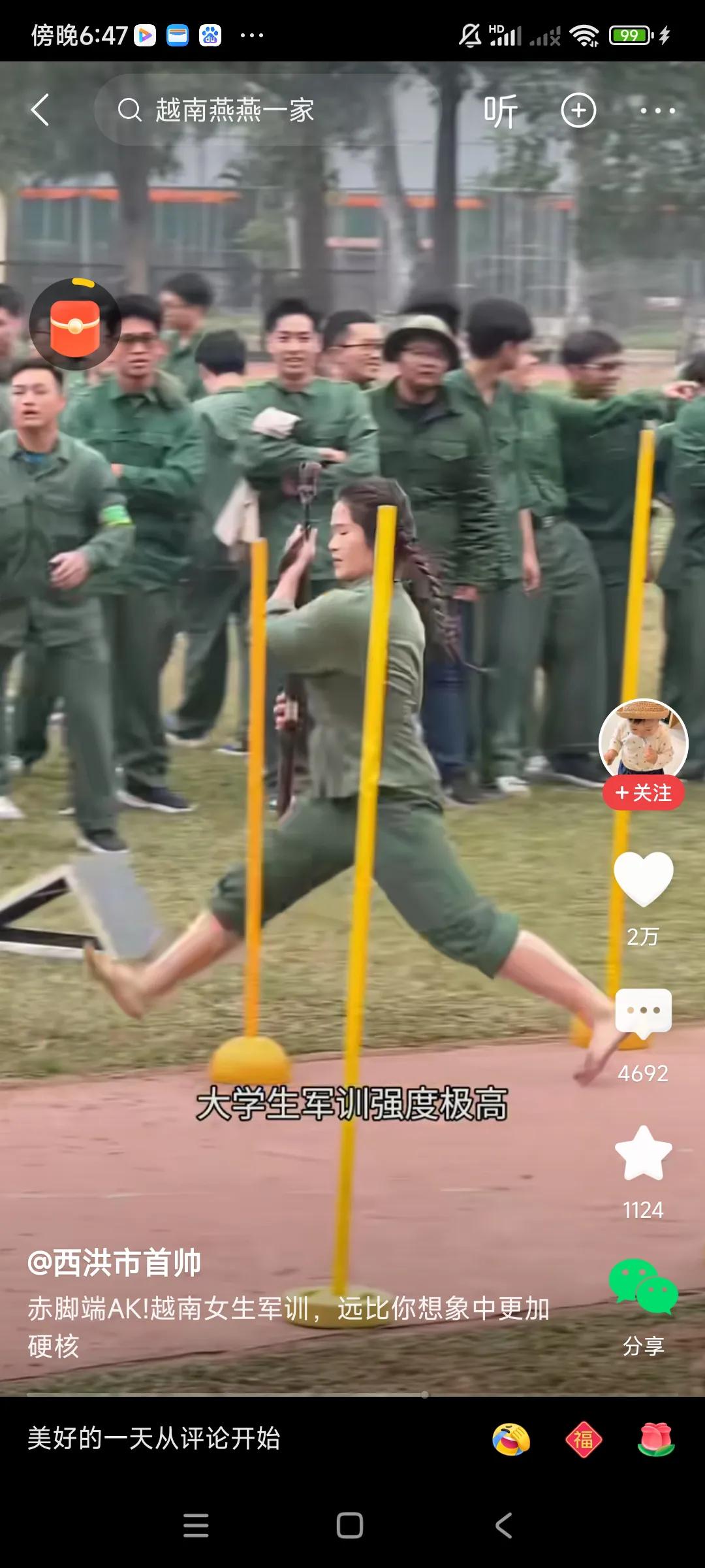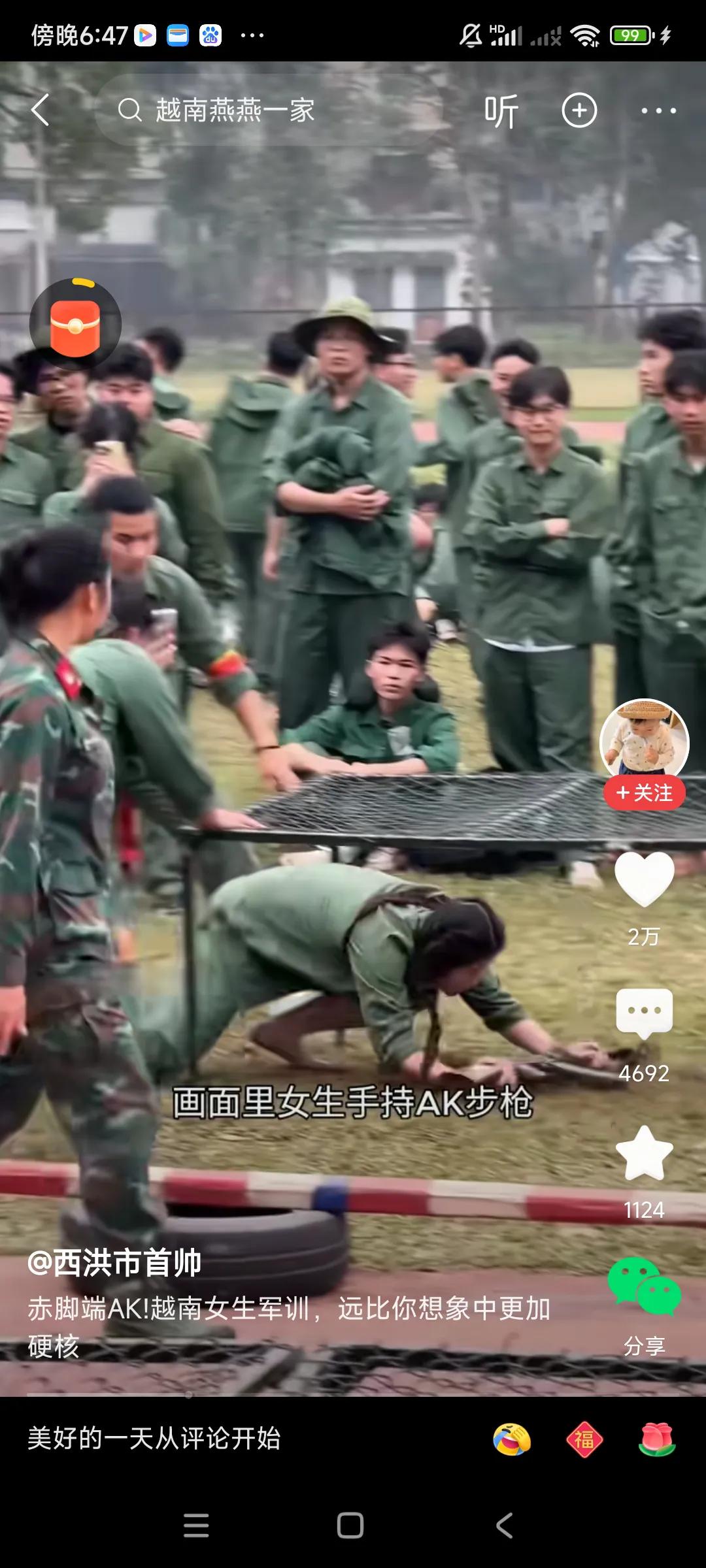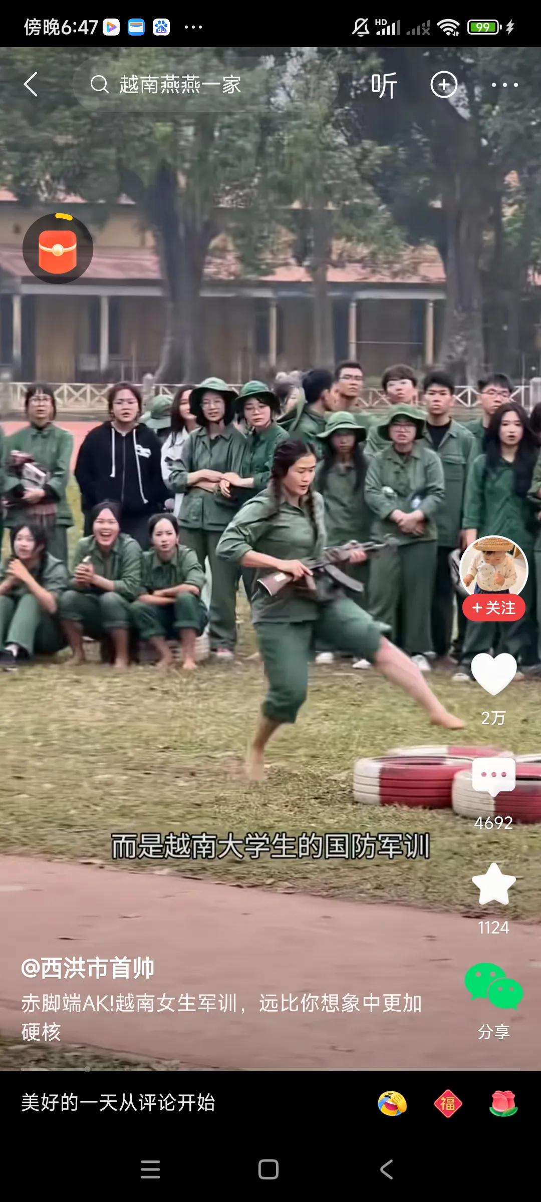 越南女兵军训,太震撼了,女大学生光脚持枪,穿越障碍,快速前进,没有一点骄气,能吃苦,像模像样,贴近实战了,[捂脸][捂脸] 纳闷,她们为啥不穿鞋,光脚,跑的飞快,不怕地上脏,非常厉害,是否特作作战时,走路没声音,[捂脸][捂脸] 我觉得咱们大学生军训,光搞队列,走正步,确实枯燥了一些,男生学下枪支原理,构造,女生学习战场救护,防身知识,这些学会了,肯定有用,,