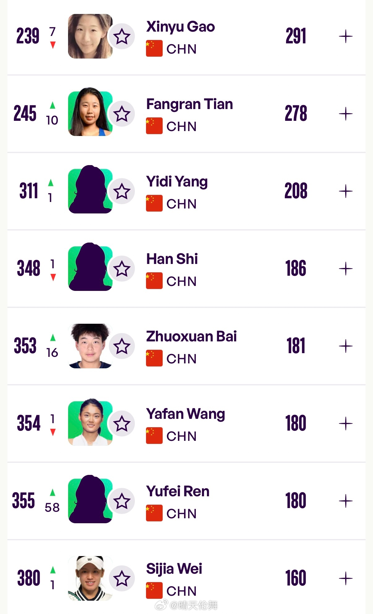 中国球员WTA单打排名更新(Top400)32 王欣瑜🇨🇳(+2)37 郑钦文🇨🇳(-7)64 张帅🇨🇳(-2)113 袁悦🇨🇳(+8)137 朱琳🇨🇳166 马烨欣🇨🇳(-1)168 王曦雨🇨🇳(+11)171 郭涵煜🇨🇳(+4)193 尤晓迪🇨🇳(+54)239 高馨妤🇨🇳(-7)245 田方然🇨🇳(+10)311 杨一迪🇨🇳(+1)348 施晗🇨🇳(-1)353 白卓璇🇨🇳(+16)354 王雅繁🇨🇳(-1)355 任钰菲🇨🇳(+58)380 韦思佳🇨🇳(+1)