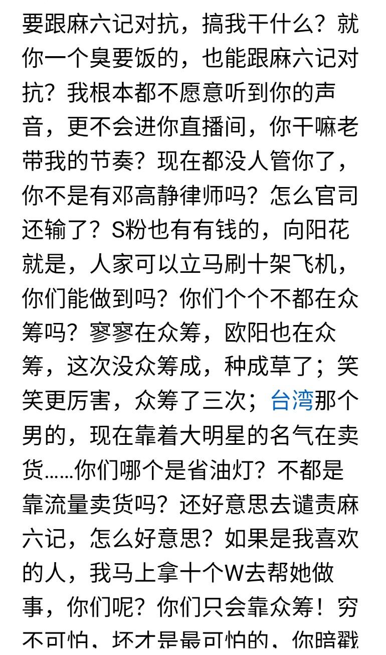 霞姐直播时说:“你是一个离异的、私生活不检点的女人,没有经济收入,带着一个小女孩,一个臭要饭的,也能跟麻六记对抗? 霞姐火力全开,怒骂欧阳三八婆靠在互联网上蹭流量、骂人过日子。她说的是欧阳三八婆,说这些话时正好刷到她的直播间。可能就要有像霞姐这种主持正义的人站出来,反击那种歪风邪气的坏人。