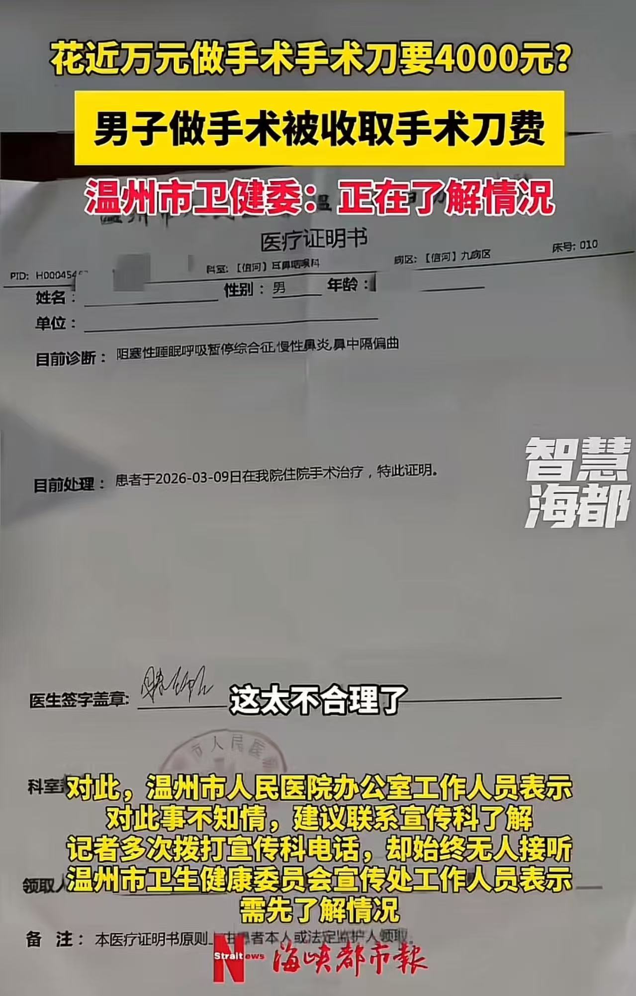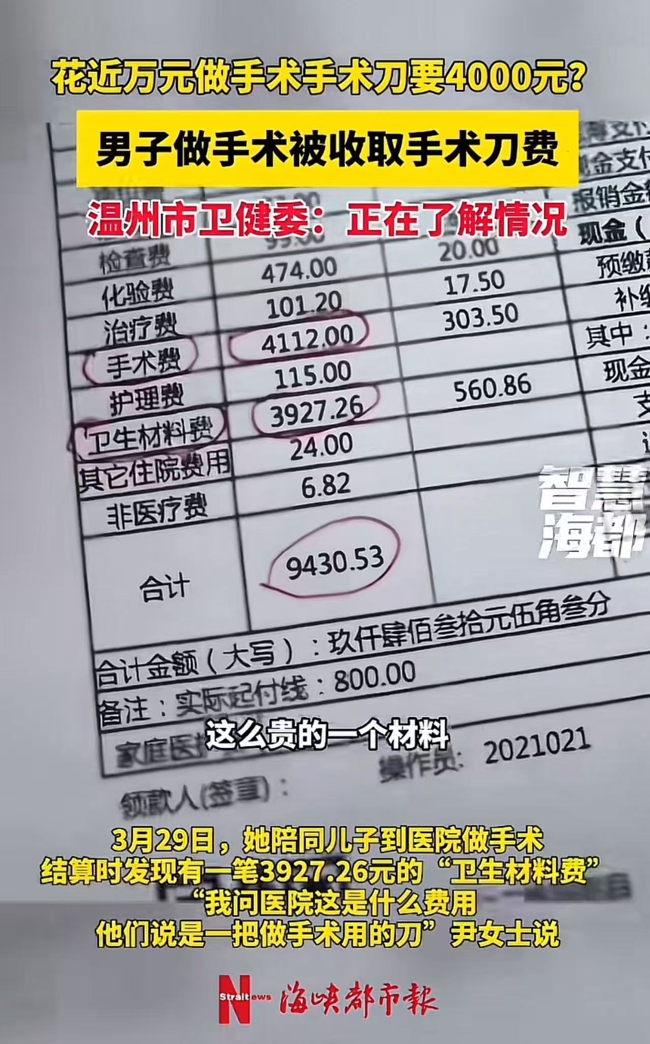 “孩子花近万元做手术,手术刀要4000元?”孩子妈妈:“已经给了手术费了,还收手术刀的费用,怎么可以要别人自己带刀呢?”网友炸锅!