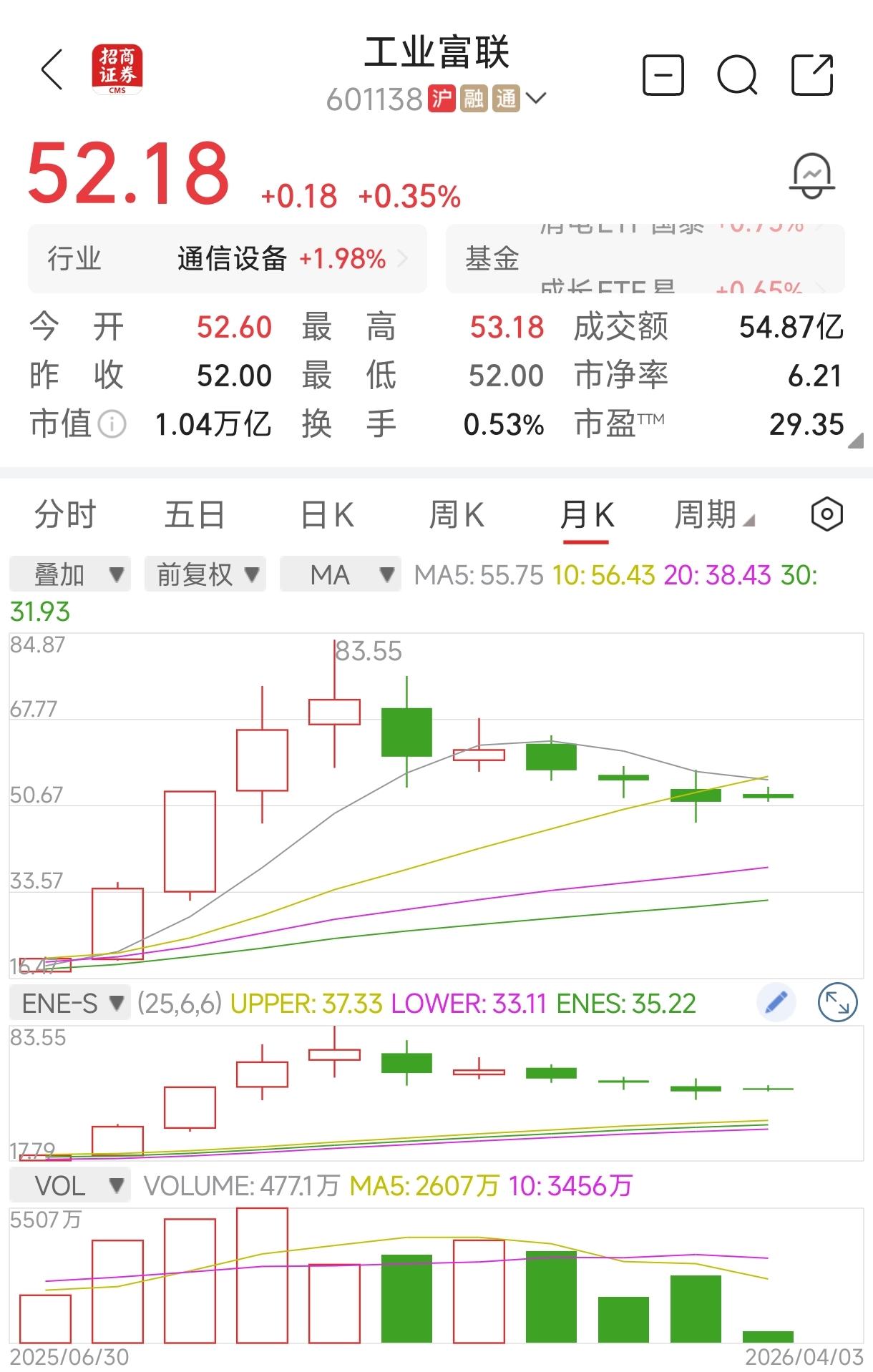 工业富联一季度业绩大涨已成定局。 鸿海精密(富士康)披露,第一季度营收约合666亿美元,同比增长29.7%。其中,云端和网络产品部门因AI需求强劲实现大幅增长。这就意味着,A股上市公司富士康工业富联一季度业绩大涨已成定局。 工业富联业务主要聚焦AI服务器、云计算、5G设备及工业互联网等高技术领域,2025年受AI需求增长,净利润增长51.99%,达创纪录的352.9亿元。2025年4个季度的增幅分别是:Q1增长25%,Q2增长51%,Q3增长62,Q4增长58%。从鸿海集团的一季度业绩来看,工业富联作为AI服务器产品的主力,一季度业绩增长将不低于30%,个人乐观预计,增速甚至可达到40%,净利润72亿元以上。 工业富联股价于2025年10月份达到83.55元的高点,当前股价52.18元,已经回撤37.55%,其中今年累计跌幅15.5%。今日A股