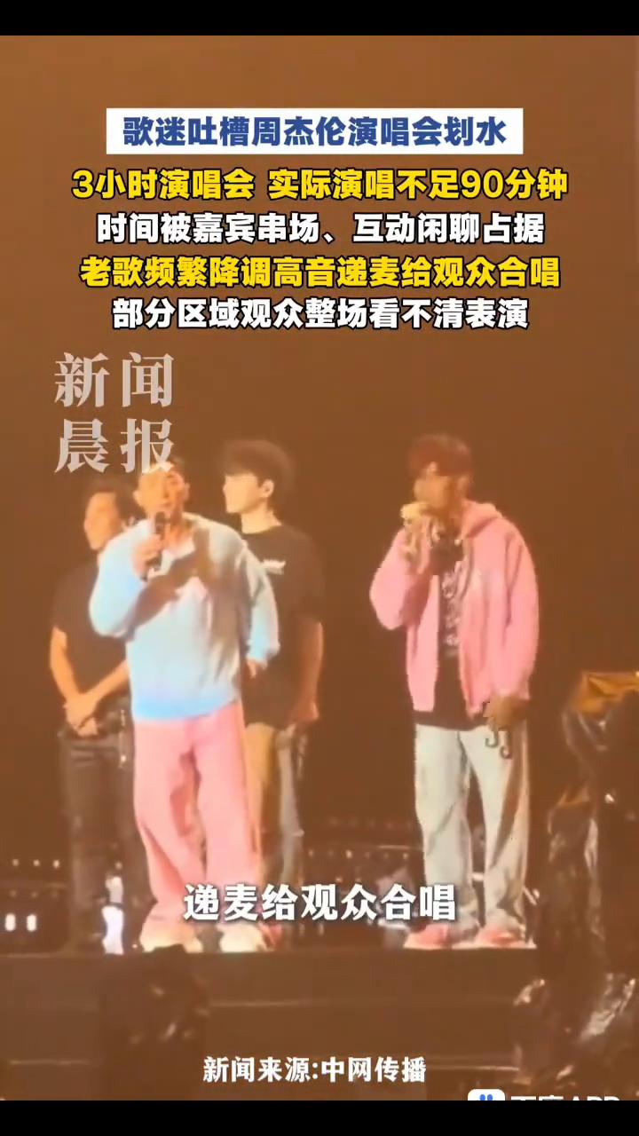 周杰伦演唱会被吐槽划水。 晨报。 3小时演唱会实际演唱不足90分钟。近日部分歌迷吐槽周杰伦演唱会划水,时间被嘉宾串场、VCR播放、互动闲聊占据点歌环节,甚至推销未背熟歌词的新歌。老歌频繁降调高音递麦给观众合唱,暴雨中舞台延伸台过短导致两侧观众视线受阻,部分区域观众整场看不清表演。