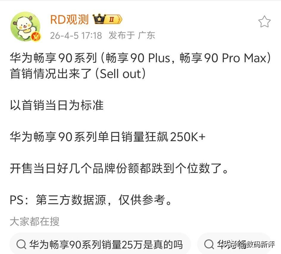 华为畅享90系列卖爆了[奸笑]首日25万台,这个表现确实很强啊,对比友商涨价的千元机在有华为品牌加持的影响力确实强,如果畅享90PM充电能给个100瓦,重量轻一点就更好了[捂脸]毕竟26年用40瓦快充还是太慢了,尤其是8500毫安电池也不小,年底可能更新畅享100Promax,希望可以把这两个点优化优化吧[思考]