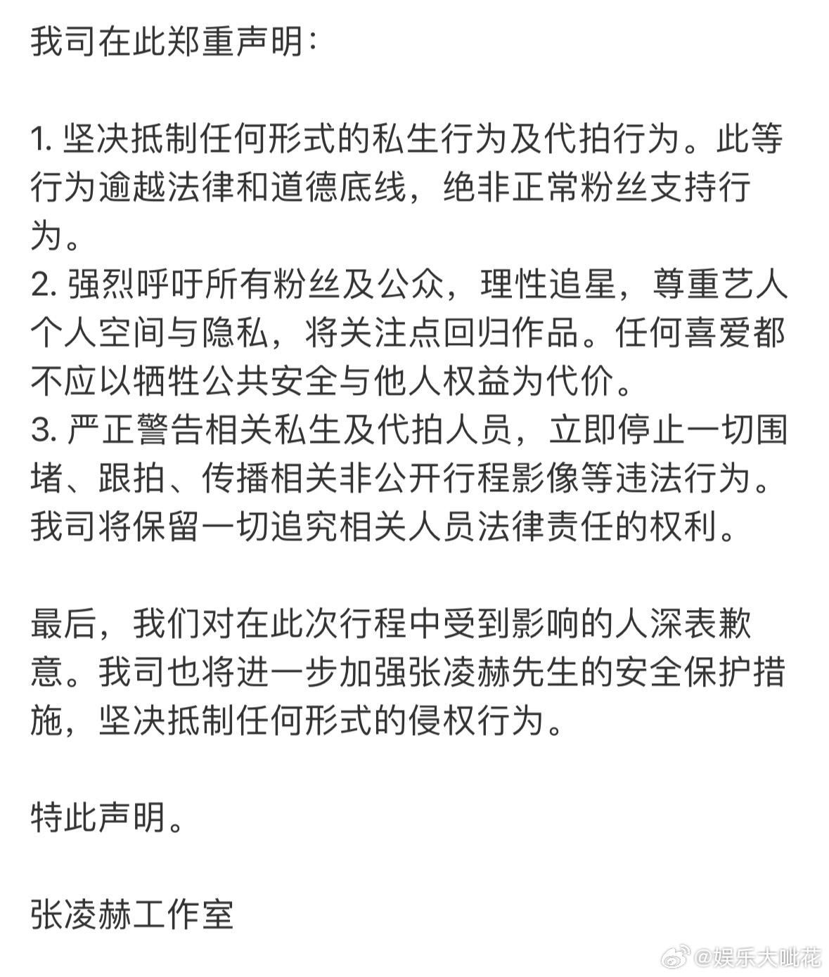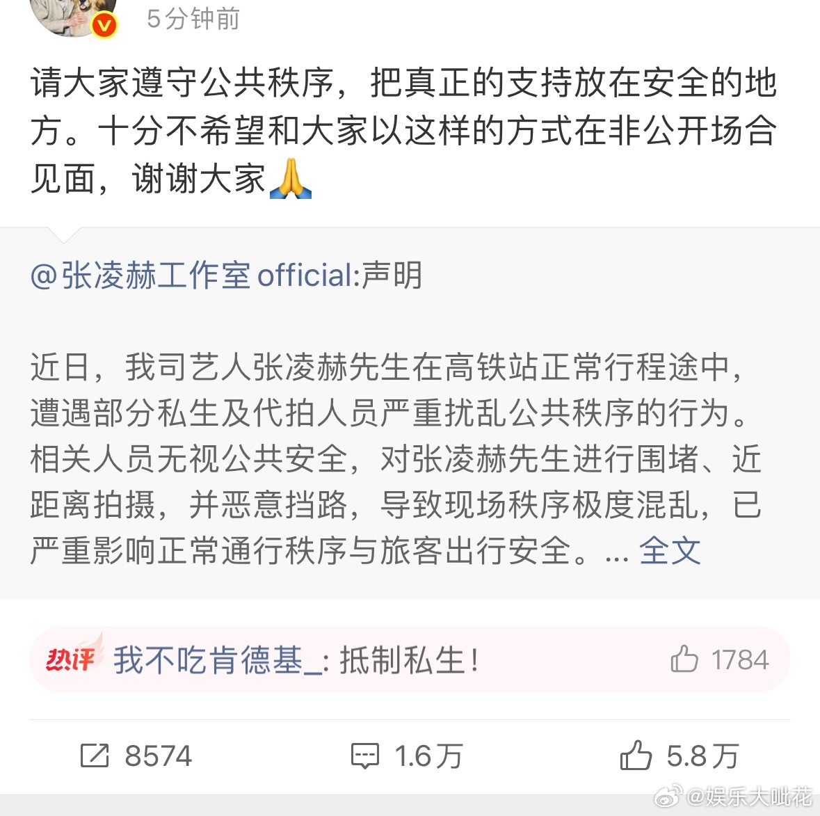 张凌赫工作室严正声明抵制私生和代拍张凌赫高铁站被恶意挡路 张凌赫工作室严正声明,坚决抵制私生和代拍。里面提到:在高铁站的正常行程中,被恶意挡路和围堵…天呢,太恐怖了,张凌赫也是及时转发,引导粉丝把支持放在安全的地方,偶像担当拉满~