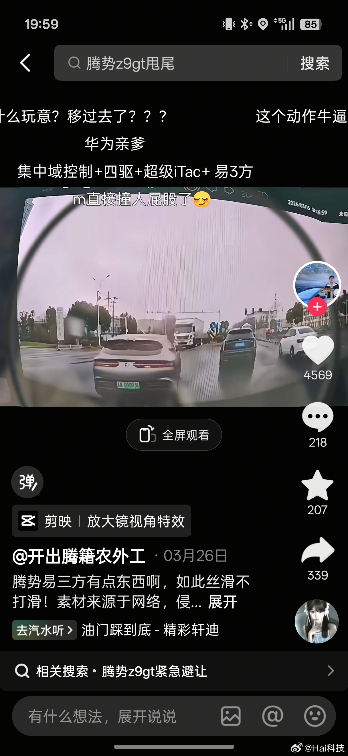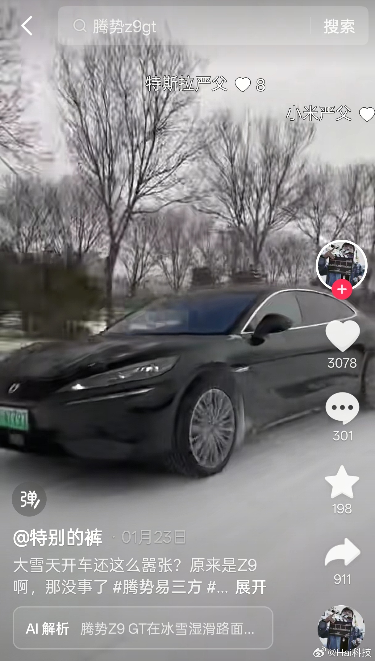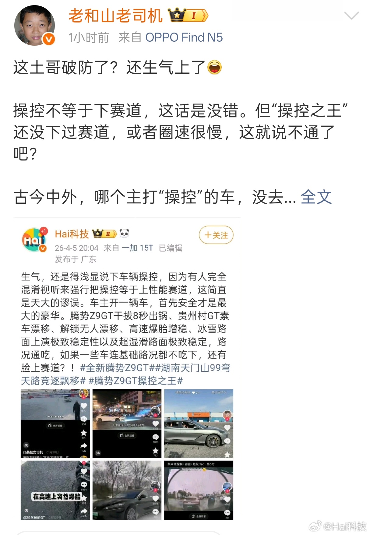 我一直强调的是要实践,别打嘴炮,拿一辆同价位车来横向对比操控,结果我发现老和山老司机这傻叉是真的不懂车,还特别喜欢混淆视听,把能做的到和做得漂亮混为一谈,60分他能等于100分,你找一辆8秒干拔的车啊,你找一辆冰雪路面敢加速敢漂移的车啊,你找一辆能够丝滑圆规掉头的车,你就回答有没有同级的车能同时做到以下操控项目:1.你知道腾势Z9GT早就上线一键漂移模式了吗?新手就能漂移2.你知道腾势Z9GT低附路面增稳系统吗?3.你知道腾势Z9GT麋鹿测试成绩吗?4.你知道腾势Z9GT转弯半径吗?5.你知道腾势Z9GT有圆规掉头、蟹行模式、易三方泊车…等等操控体验吗6.你知道全新腾势Z9GT零百加速和极速是多少吗?