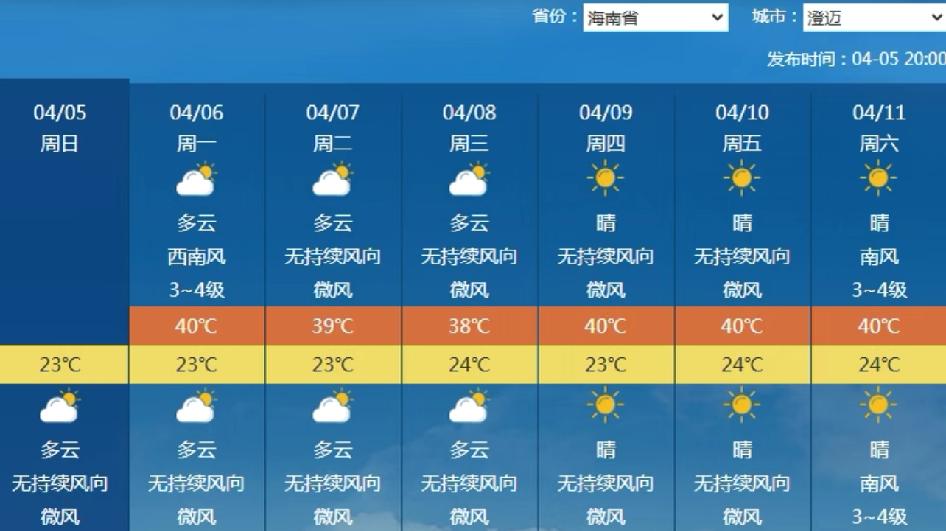 海南要迎来超长高温啦!4月5日清明,海南没下雨而是酷热,部分乡镇气温达38~40℃。6日全岛晴间多云,高温持续,澄迈最高40℃。接下来6天,海南岛持续晴热,西北半部多地高温,部分达39℃以上,澄迈9 - 11日或连续40℃高温,外出一定要注意防晒防暑呀!