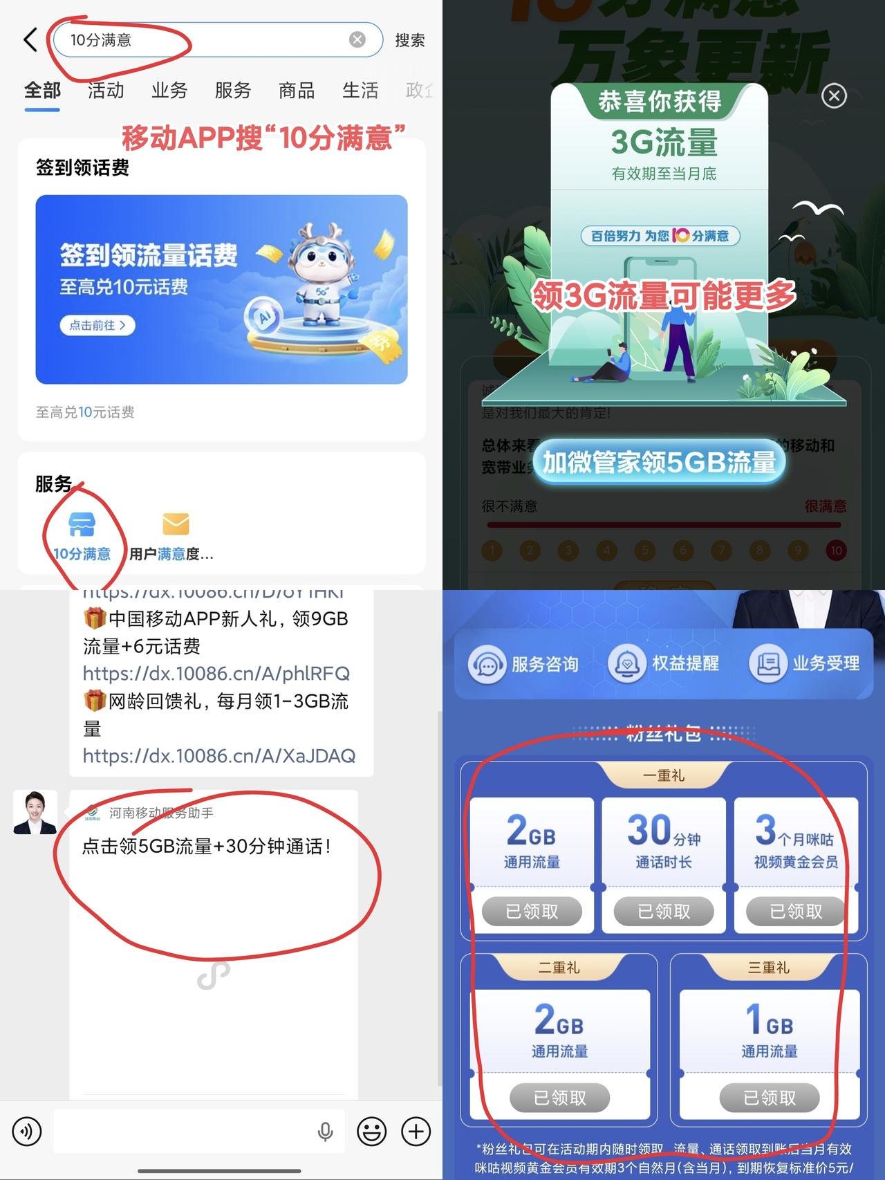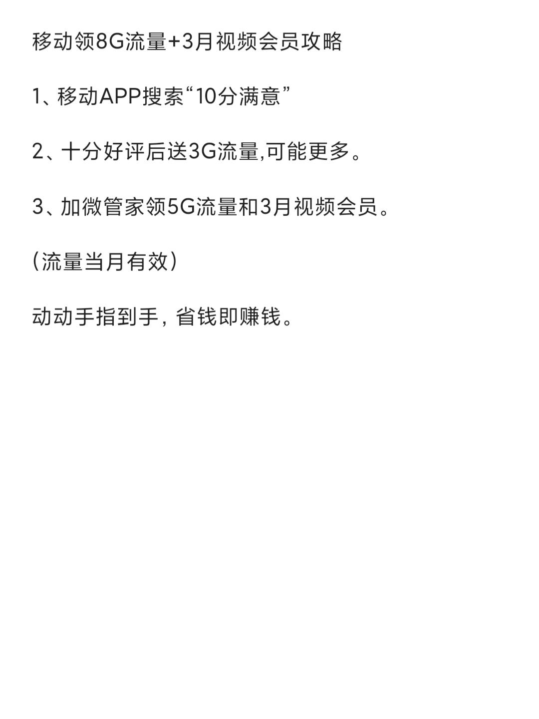 移动领8G流量+3月视频会员攻略 1、移动APP搜索“10分满意” 2、十分好评后送3G流量,可能更多。 3、加微管家领5G流量和3月视频会员。 (流量当月有效) 动动手指到手,省钱即赚钱。
