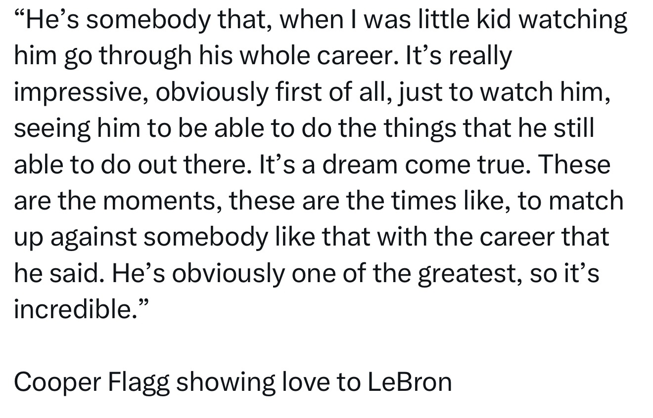 “他是我从小看着其整个职业生涯成长的人。首先,能亲眼见证他至今仍在赛场上展现如此能力,本身就令人震撼。这真是梦想成真的时刻——能与拥有这般职业生涯的传奇人物同场竞技。他无疑是最伟大的球员之一,这种感觉实在太不可思议了。”