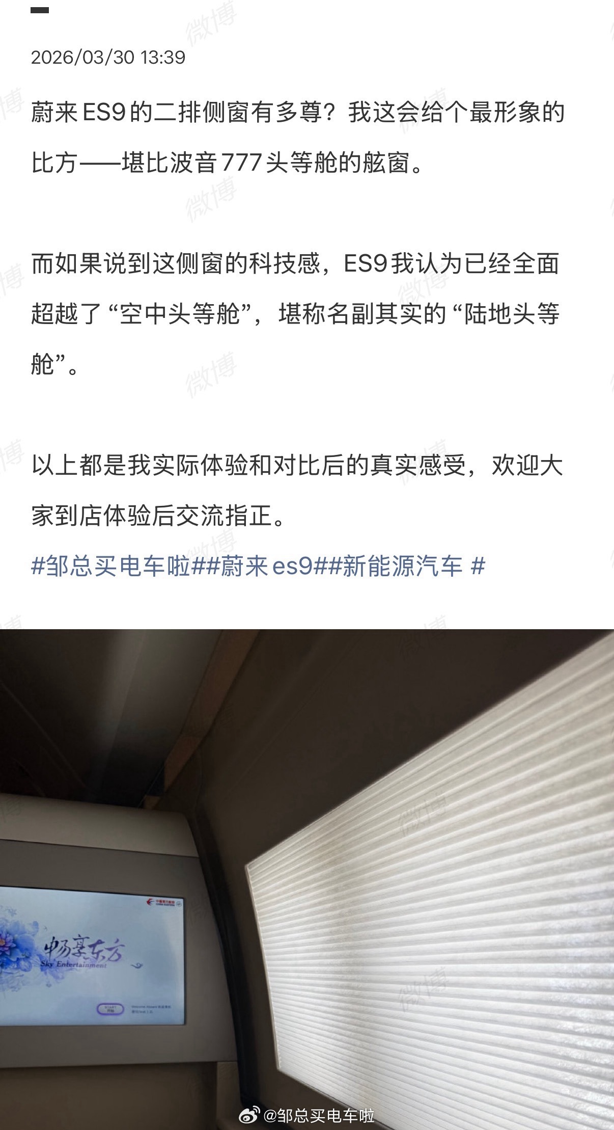 我那天看车回来还发了条微博,就提到蔚来ES9二排侧窗很“尊”,堪比甚至超越波音777头等舱,毋庸置疑这里面肯定就包括了“隐私体验”。