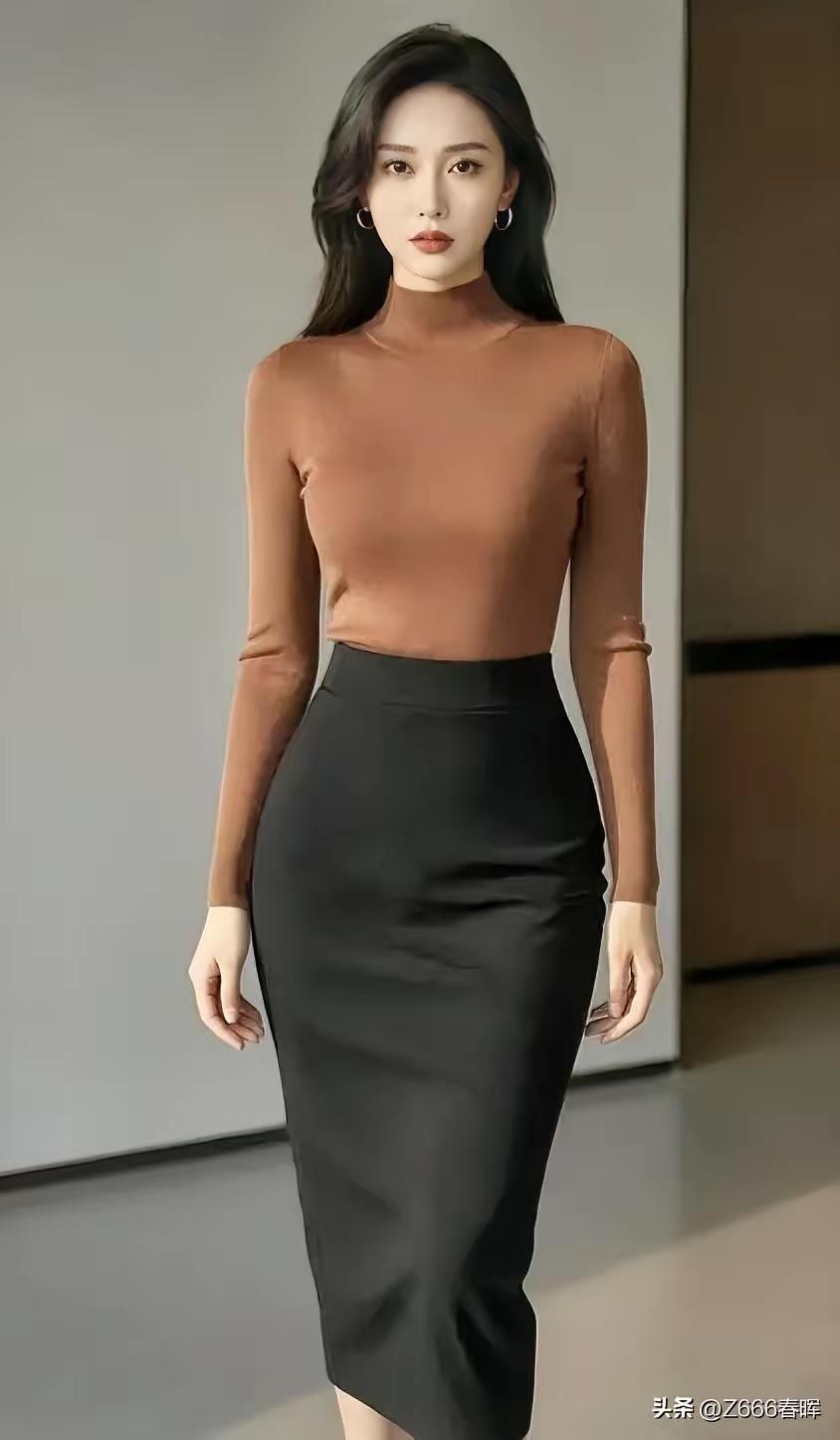 优雅气质穿搭,棕色高领衫搭配黑色半身裙,尽显时尚魅力!