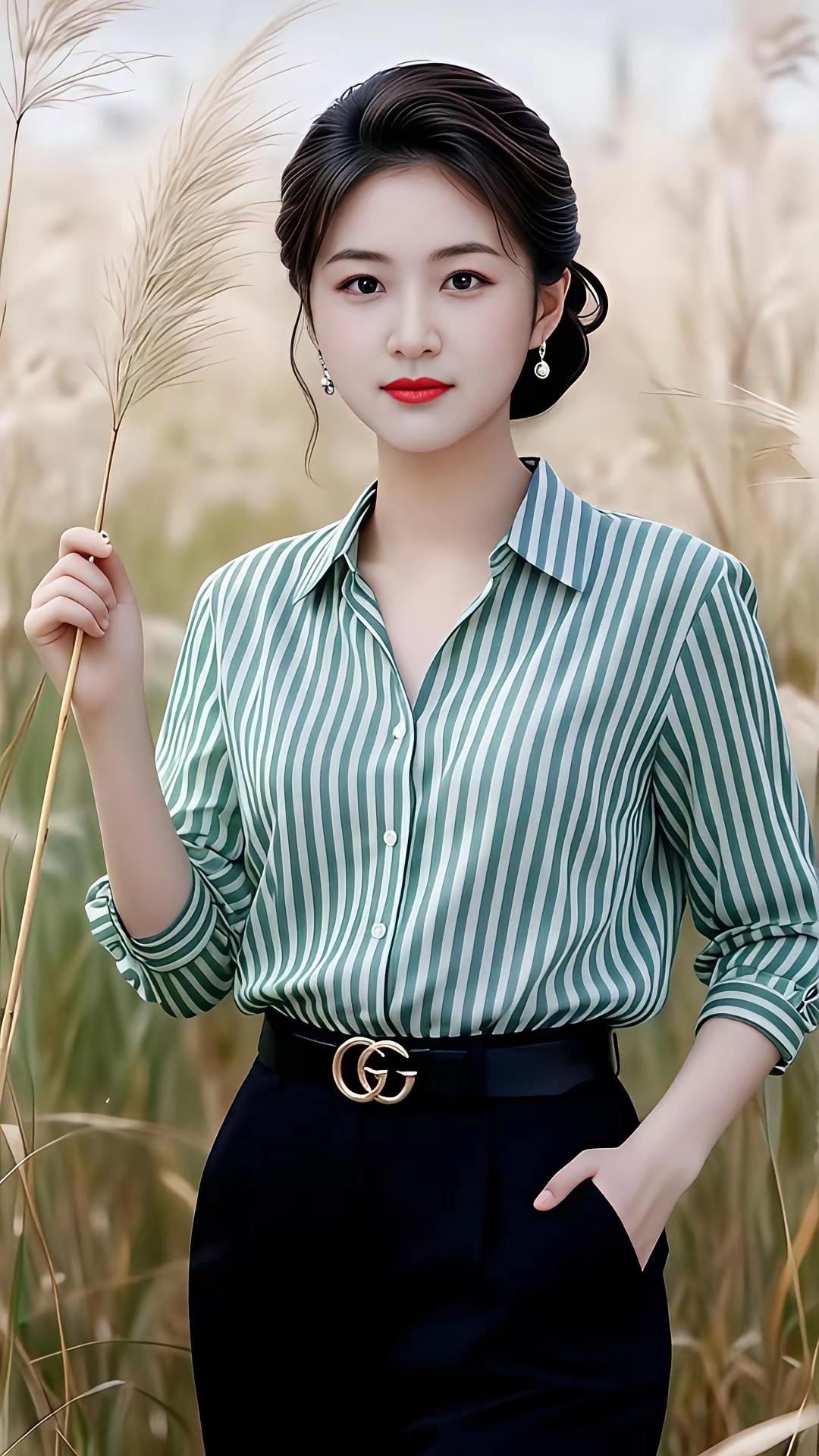 在田野中,优雅的绿条纹衬衫与黑色高腰裤搭配,尽显时尚与自然之美。
