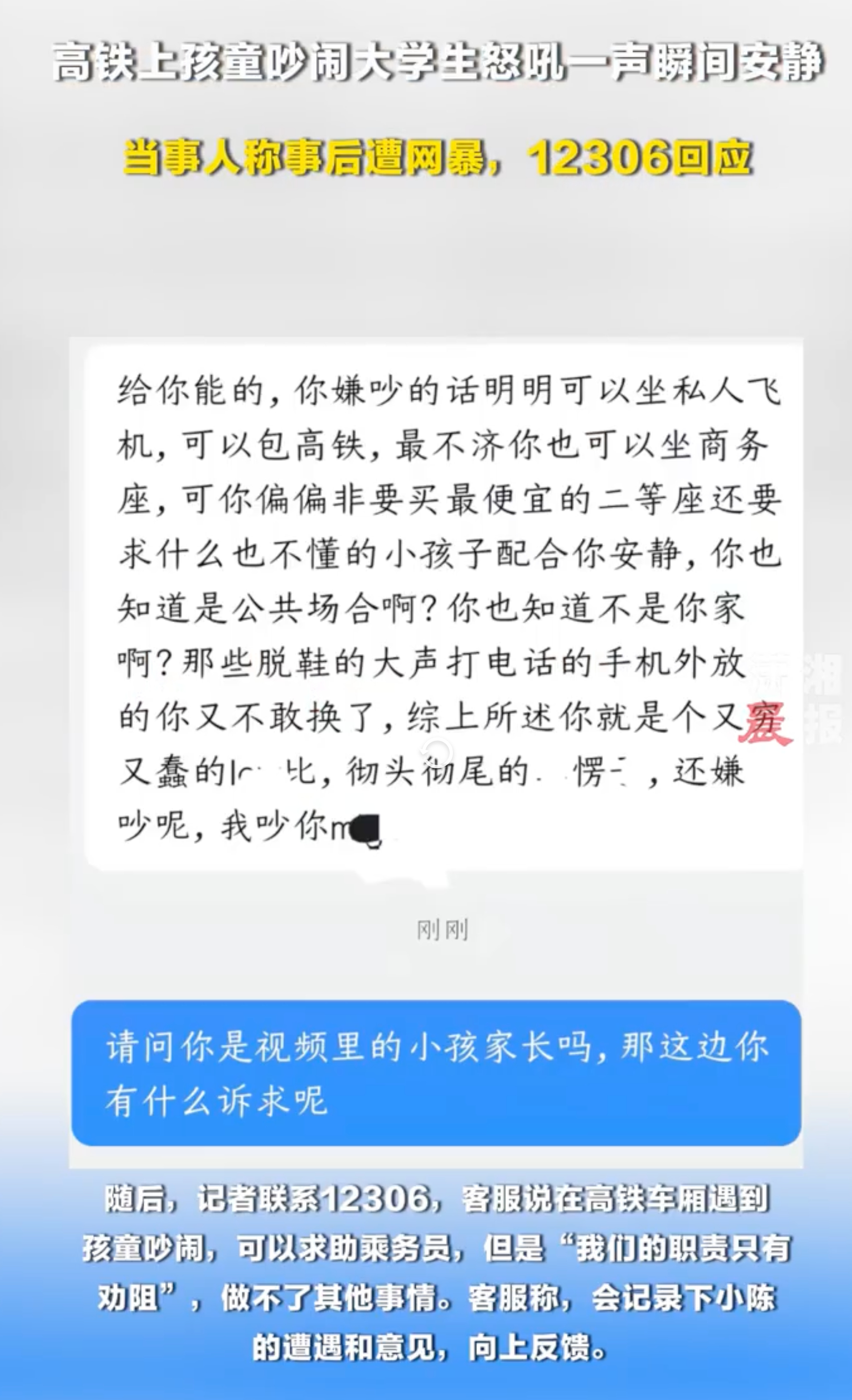 高铁上孩童吵闹大学生怒吼瞬间安静 还得是大学生来整顿!这哥们做了我没勇气做的事,最近坐高铁也遇到类似的事,前排小孩跟她妈妈一路叭叭叭,声音还贼大。据说这个大学生还被网暴了,在公共场合影响别人值得骄傲吗?