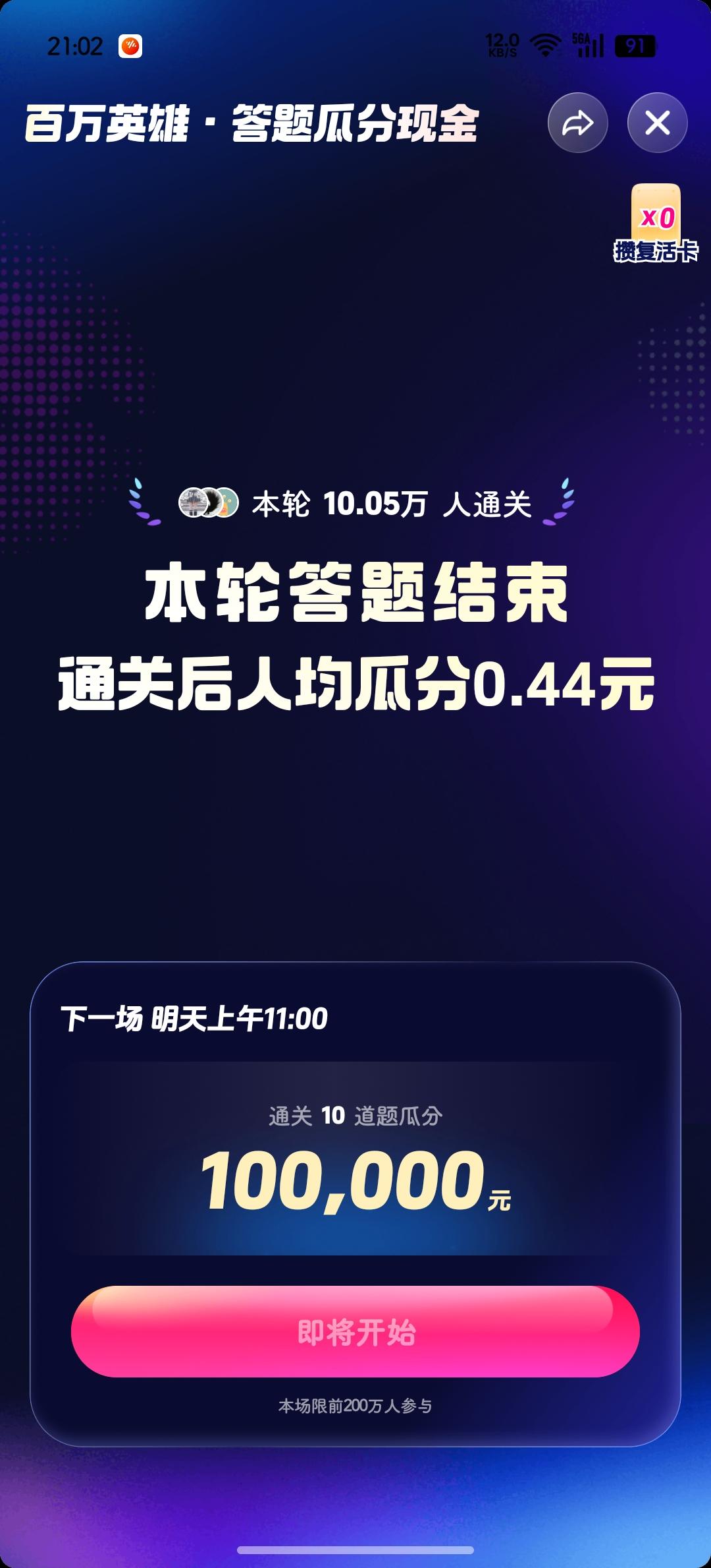 相比之下,晚场的奖金少得可怜, 这是昨天晚场的, 0.44…🈶10.05万人通关, 皆大欢喜呀![呲牙]