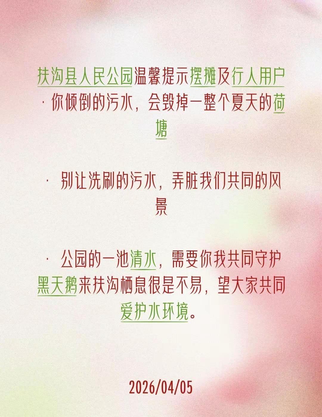 扶沟县人民公园温馨提示摆摊及行人用户•你倾倒的污水,会毁掉一整个夏天的荷塘• 别让洗刷的污水,弄脏我们共同的风景• 公园的一池清水,需要你我共同守护黑天鹅来扶沟栖息很是不易,望大家共同爱护水环境。