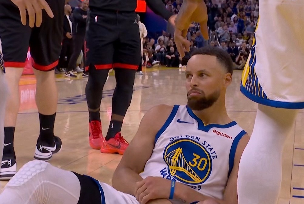 波尔津吉斯这就犯满离场了…….镜头给到替补席的库里,这个膝盖啊,看起来还是不怎么