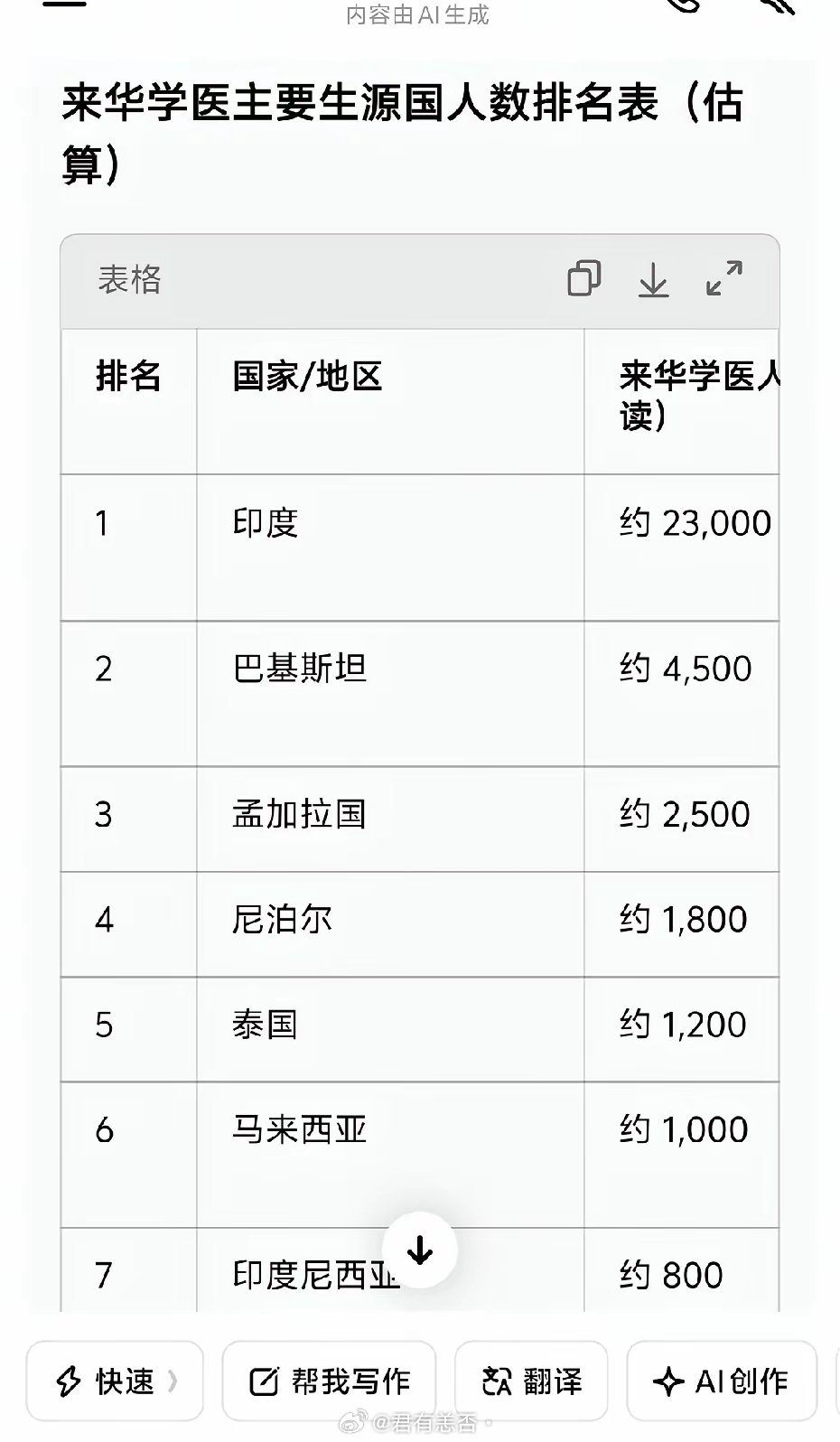 接连刷到三个在中国当医生的老外,两个疑似是来自中东——北非国家的阿拉伯人,另外一个看起来像南亚(巴基斯坦、印度、孟加拉)人。能够由本国人完成的工作,是不是应该先用本国人啊?咱不能从拉他们来上学,到各种优惠、奖学金、包食宿、热牛排……上完学了再各种岗位伺候着吧?我们国家最起码目前为止,不缺劳动力吧?就算缺那也先照顾华人同胞不行么?
