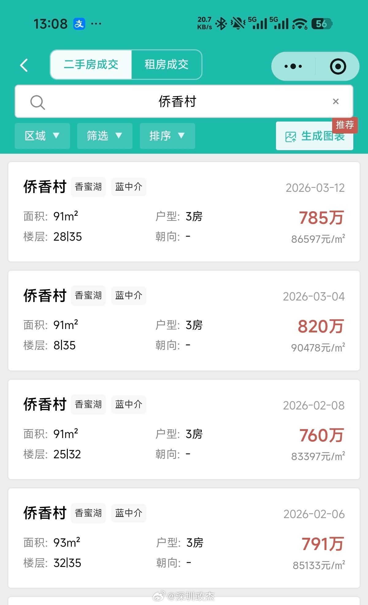 福田侨香村南向90平3房785万,满五唯一,785/90=8.72万,学位没用。