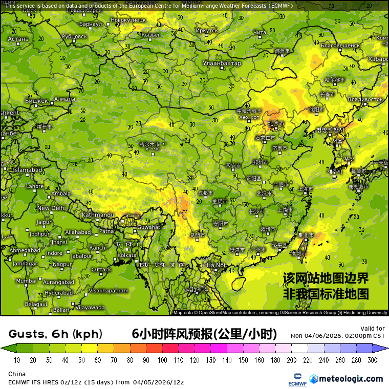 图6为本周的逐6小时阵风预报,可见阵风强度有明显的日变化特征,14-20时达到最强,夜间减弱。图中标注40的亮黄区,对应风速为40公里/小时,也就是11.1米/秒,6级以上的风。橙色70公里/小时的风速,也就是19.4米/秒,8级以上的风。风干物燥,务必注意防范火灾的发生。
