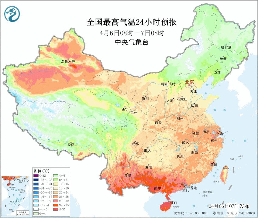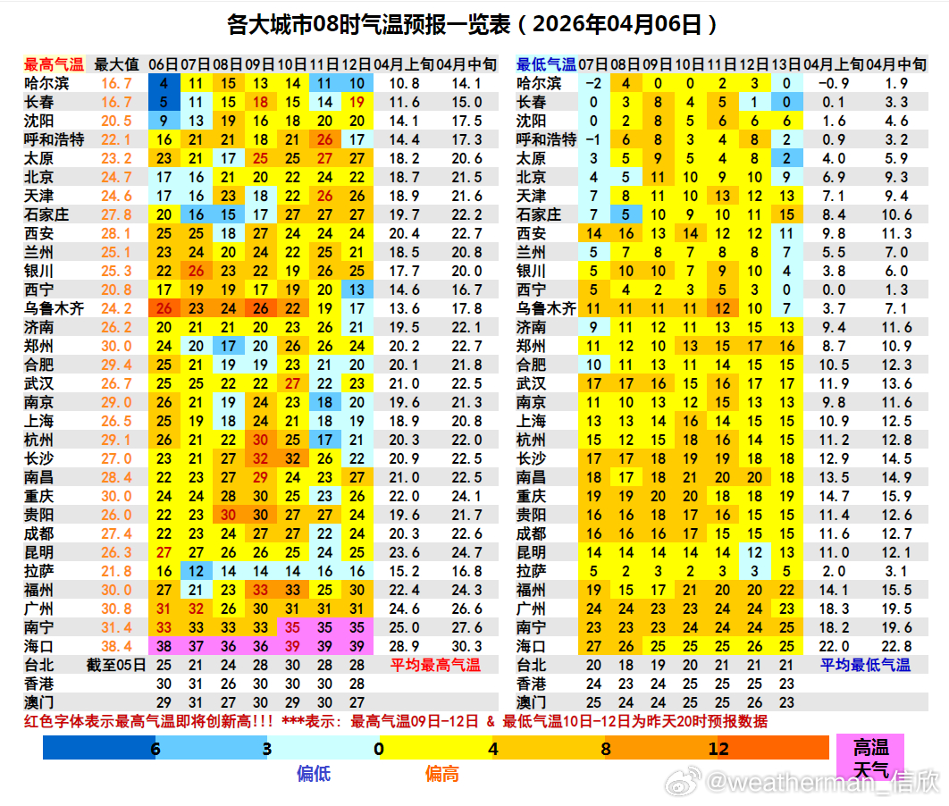 2、气温本周各地的气温走势,并不相同。海南因为持续受到副热带高压的影响,将出现连续高温。海口预计10日最高39℃,不仅会创出今年省会城市气温新高,也可能打破当地4月上旬最高纪录(38.9℃)。南宁预报10-12日最高35℃,可能拿下当地今年的首个高温。总之,华南热热热,气温持续偏高。