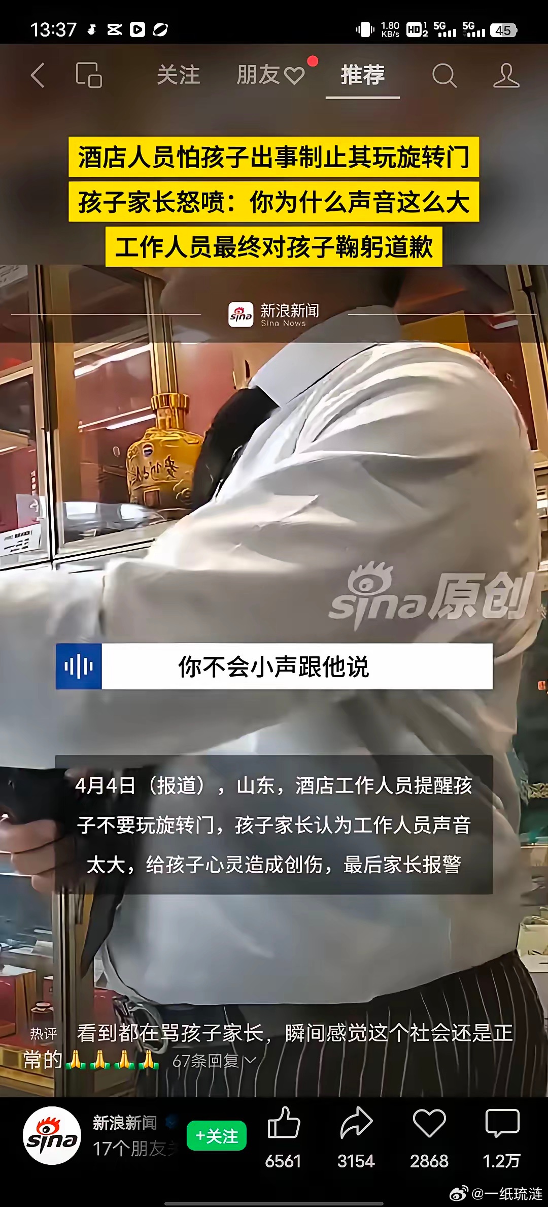 山东旋转门事件现在无人不知无人不晓了,这位家长你真是好样的,觉得你教育的孩子未来肯定有问题。服务员为什么要道歉,难道服务员的呐喊有错吗,为了你家孩子的安全呀,如果你家孩子在旋转门里除了事故,恐怕你要发疯吧。那时你就好开始怪罪酒店了,我相信未来有一天,你家孩子总会得到报应的,只是会遭到社会的毒打,一直想知道这是哪家酒店,发生在哪个城市啊。