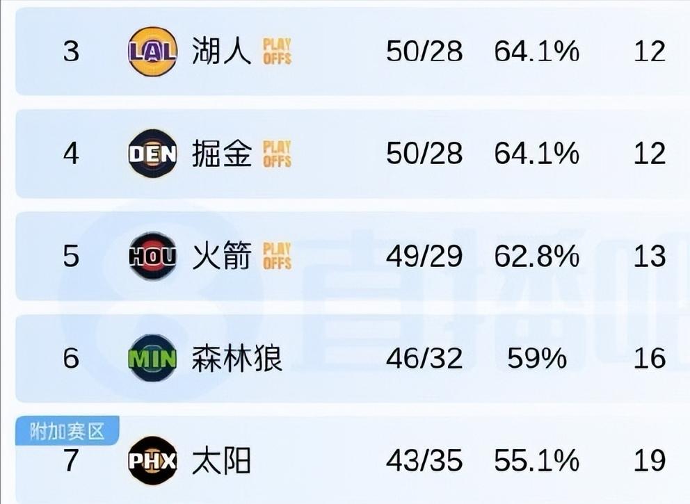 西部3-6排名争夺: 3、湖人——50胜28负,12 4、掘金——50胜28负,12 5、火箭——49胜29负,13 6、森林狼——46胜32负,16 7、太阳——43胜35负,19 从各队的情况来看,太阳基本没有直通季后赛的机会了,只剩下理论上的可能。 而湖人伤了东契奇和里夫斯,基本上很难赢球,排名肯定下跌。 唯一的悬念,就是湖人和火箭,谁是第4,谁是第5。 3-6排名预测:掘金、火箭、湖人、森林狼。 对湖人而言,第4和第5也就一个主场的差距,没有东契奇和里夫斯,是肯定打不过火箭的。 如果通盘考量,现在就可以轮休詹姆斯了,直接等待季后赛开启,看看满血的詹姆斯和斯玛特,能不能帮助湖人赢下一两场比赛。