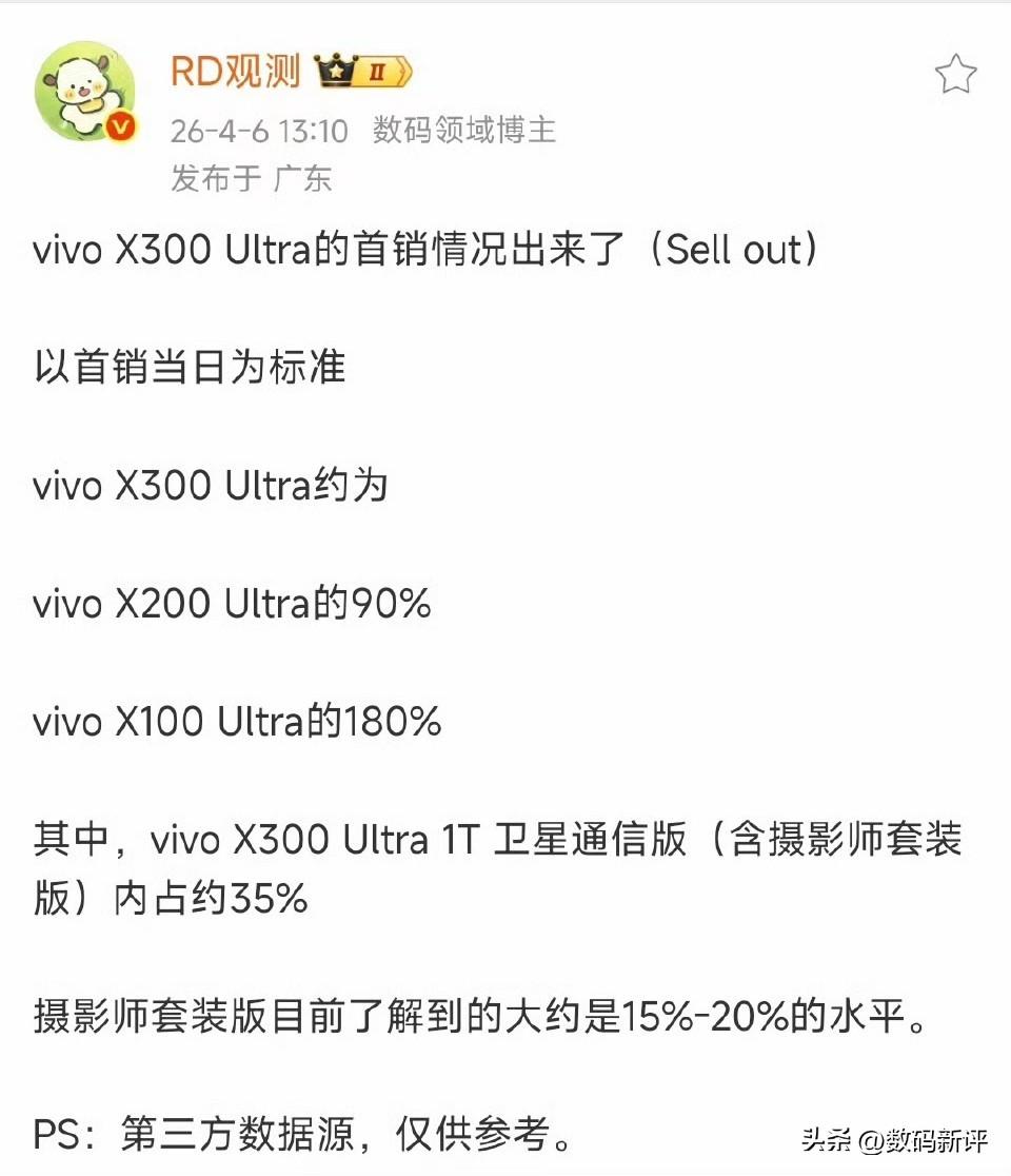 vivoX300Ultra首销情况不错!达到了上一代X200Ultra的90%,毕竟涨价这么多,还是很多人支持了的,35%的人选择了顶配摄影师套装!vivo旗舰机均价一下就拉上去了[捂脸]如果内存一直涨 明年的Ultra价格还得涨,大概率就是7499甚至取消12+256,直接16+512版本8499起了,还是很大可能性的