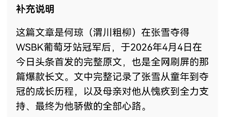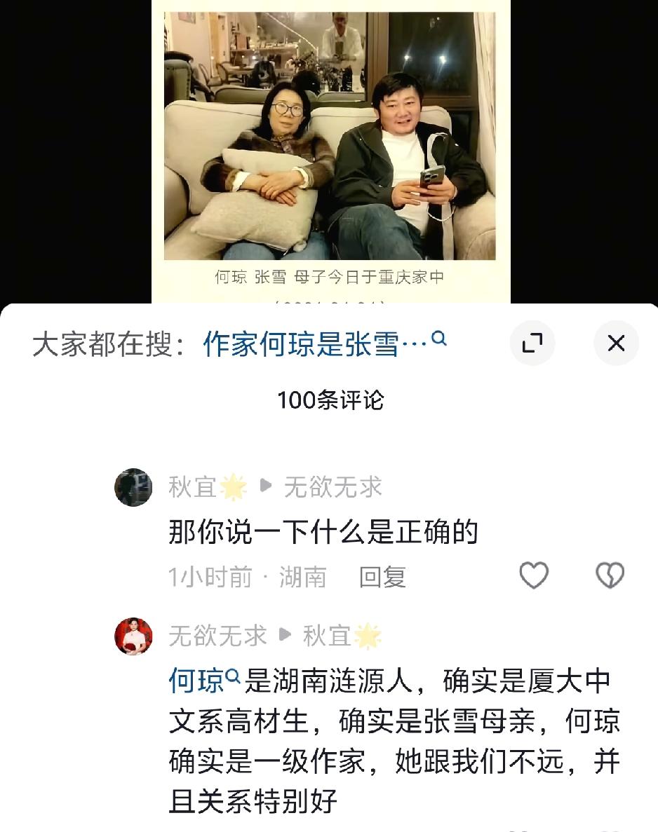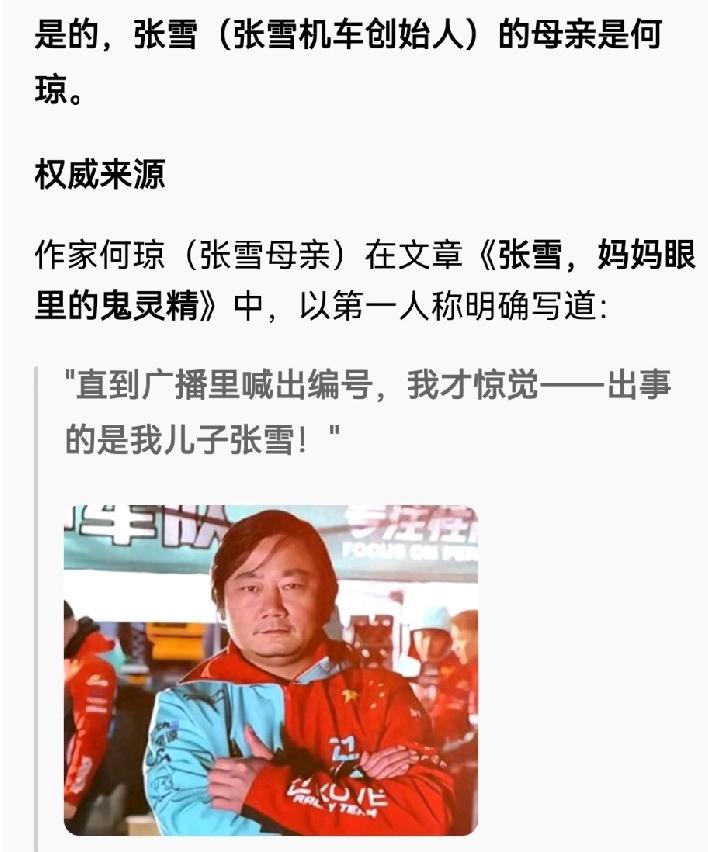 张雪母亲何琼为儿子写了一篇文章:张雪,妈妈眼里的机灵鬼。4月4日在头条首发,很多头条的读者都读了这篇文章,文中完整记录了张雪从童年到夺冠的成长历程。何琼是湖南涟源白马镇人,后来改嫁到福建。张雪在创业过程中,母亲也一次次帮他。何琼是福建厦门大学中文系毕业的,一级作家。原来张雪有这么一位优秀的妈妈。